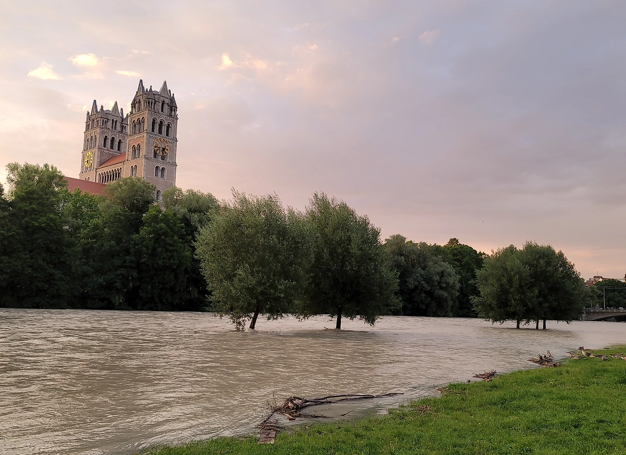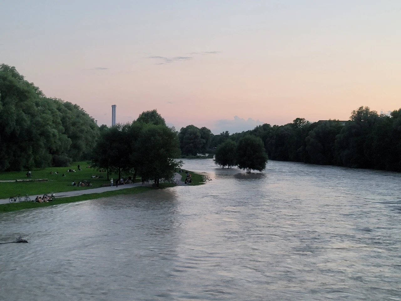 2021.7.19. 저녁 9시의 이자르강. 산책로의 나무들이 물 속에 서 있다.