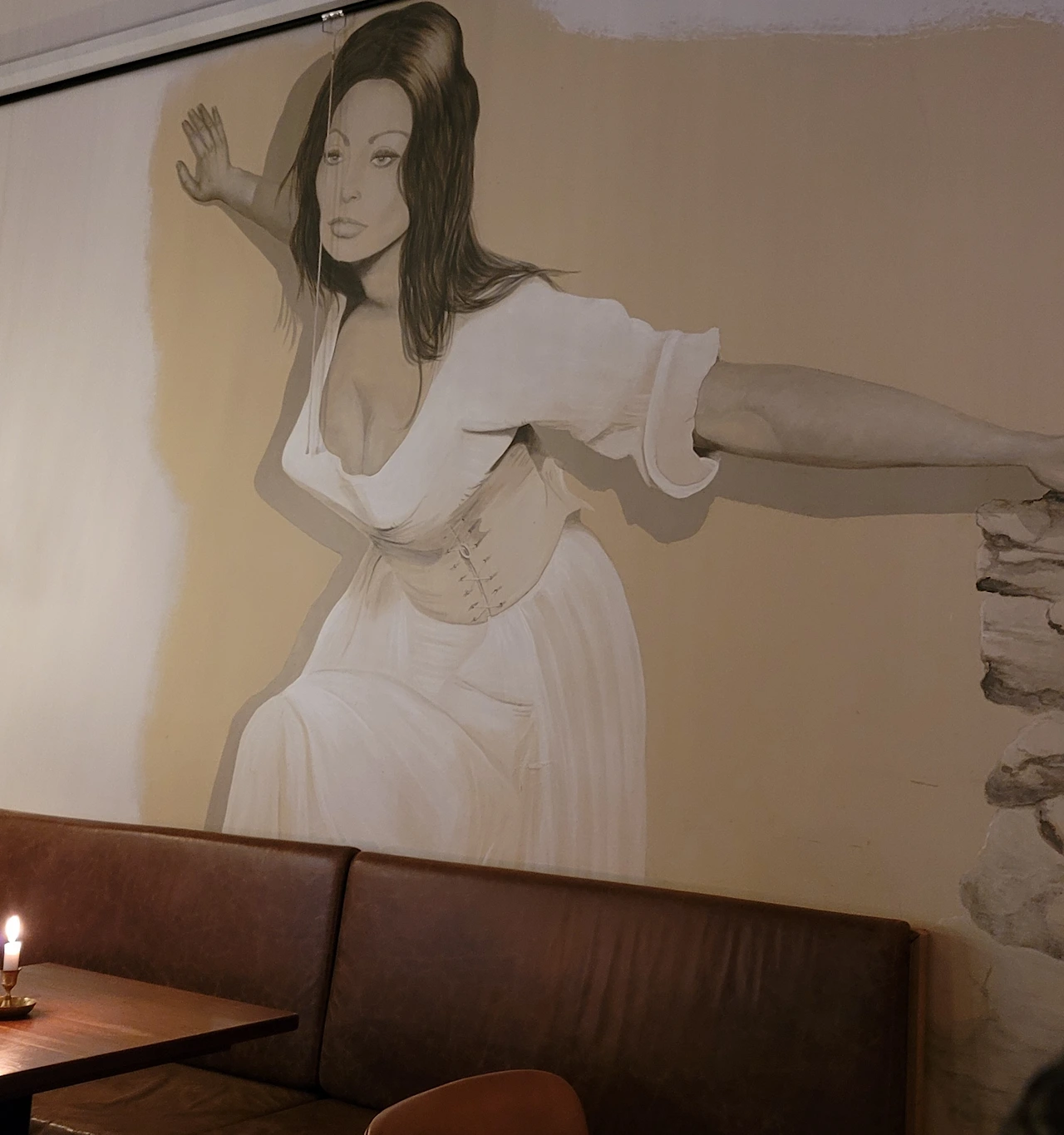 이태리 레스토랑 소피아의 밖과 안(위). 레스토랑 안에 그려진 소피아 로렌 벽화와 우리 집 해바라기(아래).
