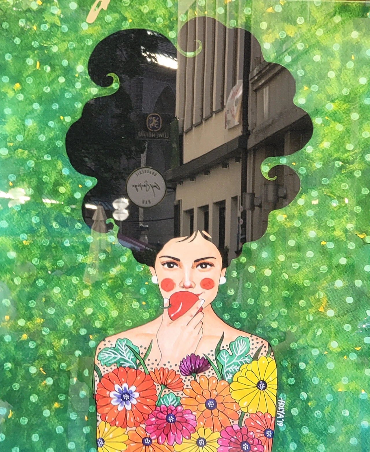 테아티너 슈트라세의 신발 가게 윈도우에 걸린 그림(왼쪽). 퓐페 회페 쇼핑 센터 갤러리에 걸린 그림(오른쪽).