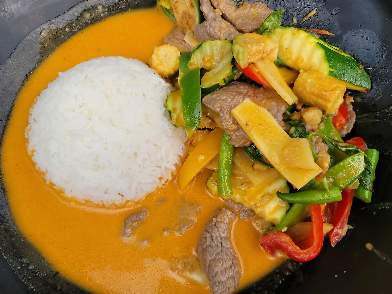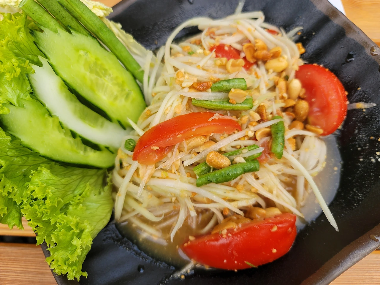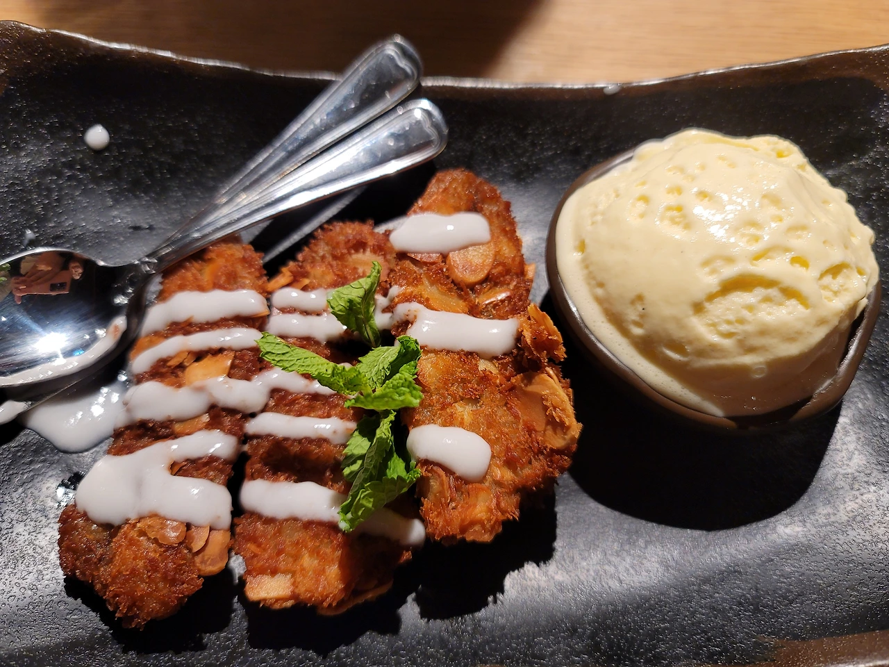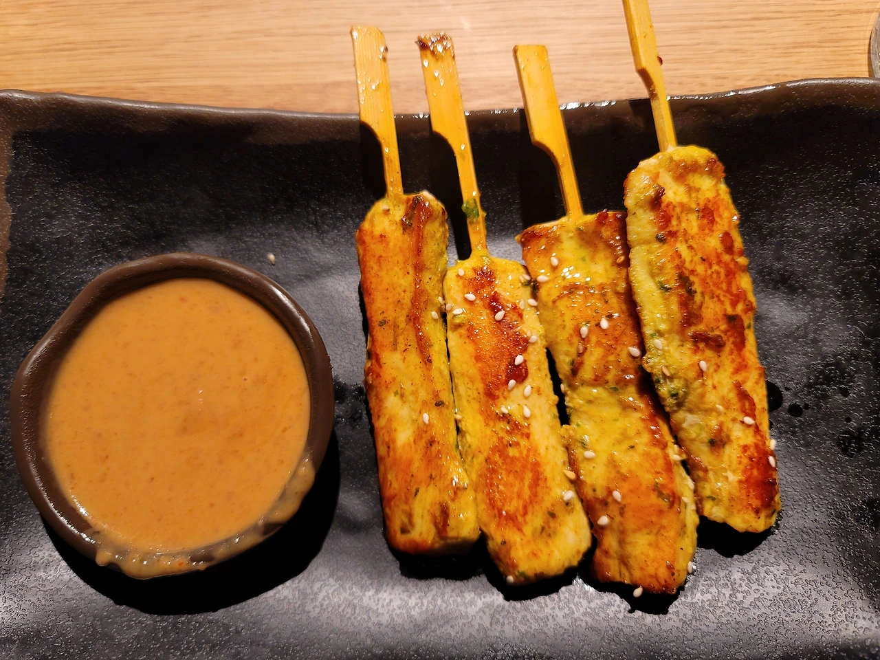 태국 사람인 율리아나 아빠가 엄지척을 한 뮌헨의 태국식당 MunMun. 저 음식을 맘껏 먹고 마지막 항암을 마쳤지. 소고기 커리와 파파야 샐러드(위) 닭꼬치와 바나나 튀김(아래)
