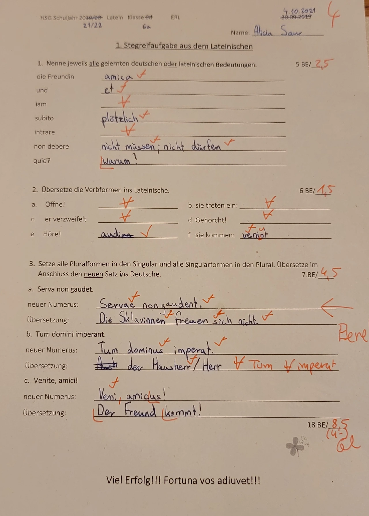 아이의 첫 라틴어 예비시험은 1)어휘 2)문법(동사 변화) 3)라틴어로 쓰인 복수 문장을 단수 문장으로 고치고, 독일어로 해석하기였다.
