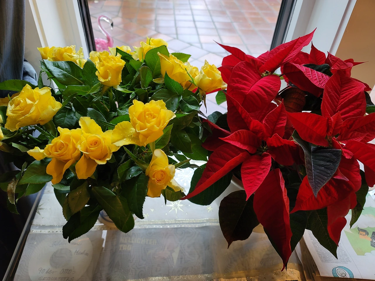 카타리나 어머니의 애플 쿠헨/아드벤스 /크리스마스 쿠키 (위). 내가 어머니께 선물한 노란 장미와 어머니댁의 크리스마스 꽃(아래).