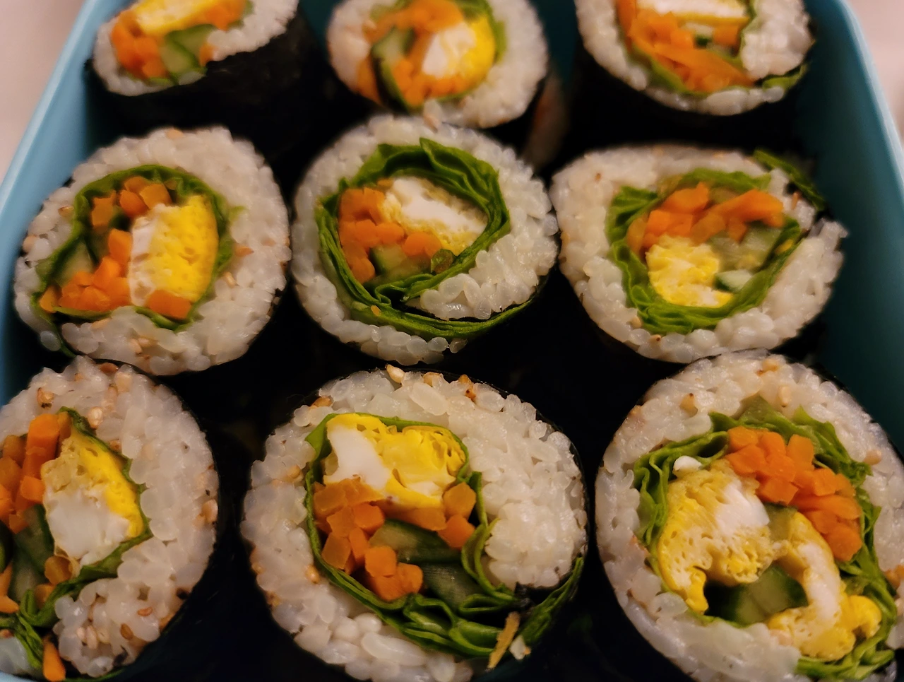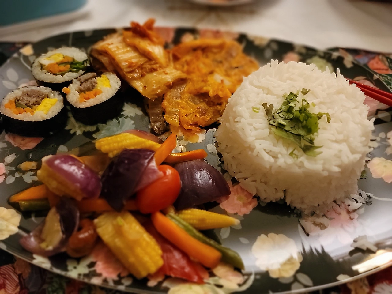 2021.12.31 오후 4시에 잠깐 서광이 비쳤다(위). 나의 김밥과 이사벨라의 태국식 야채 볶음(가운데).