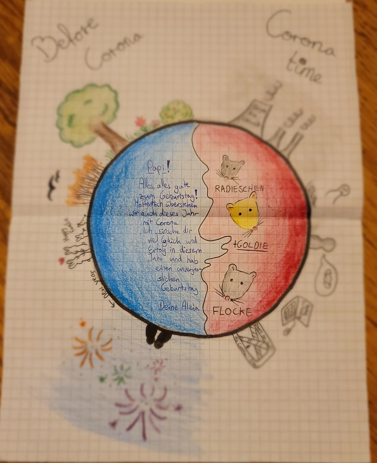 쥐들이 우리 집에 온 지 1년이 되는 날. 알리시아는 친구 한나와 생일 쿠키를 굽고 풍선을 불었다. 맨 위의 검게 탄 망한 쿠키마저 예뻤다. 아래는 파파에게 쓴 생일 카드.