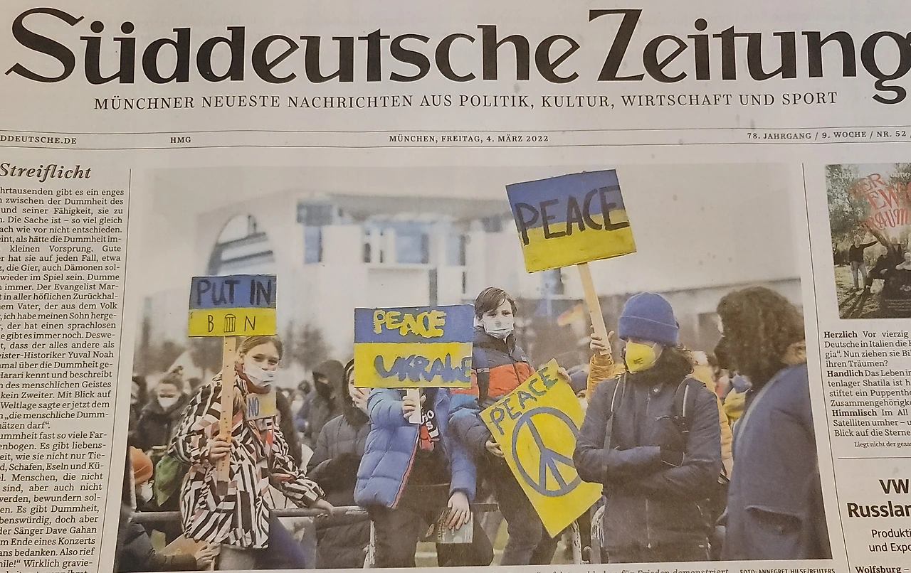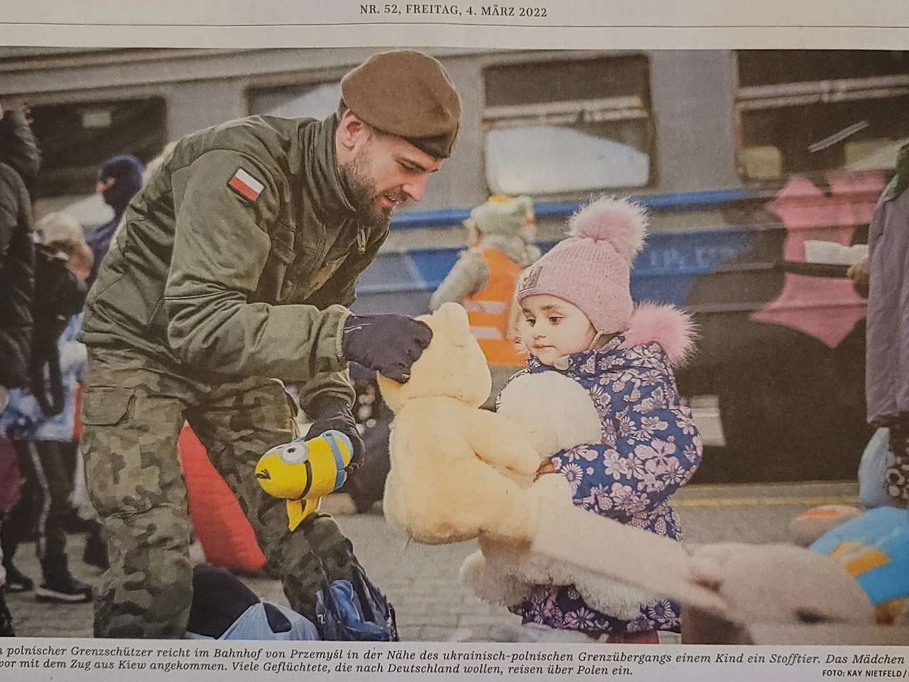 2022.3.4일자 Süddeutsche Zeitug. 독일 청년들의 반전 시위(위). 기차로 폴란드에 도착한 우크라이나 아이에게 인형을 주는 폴란드 군인(아래).