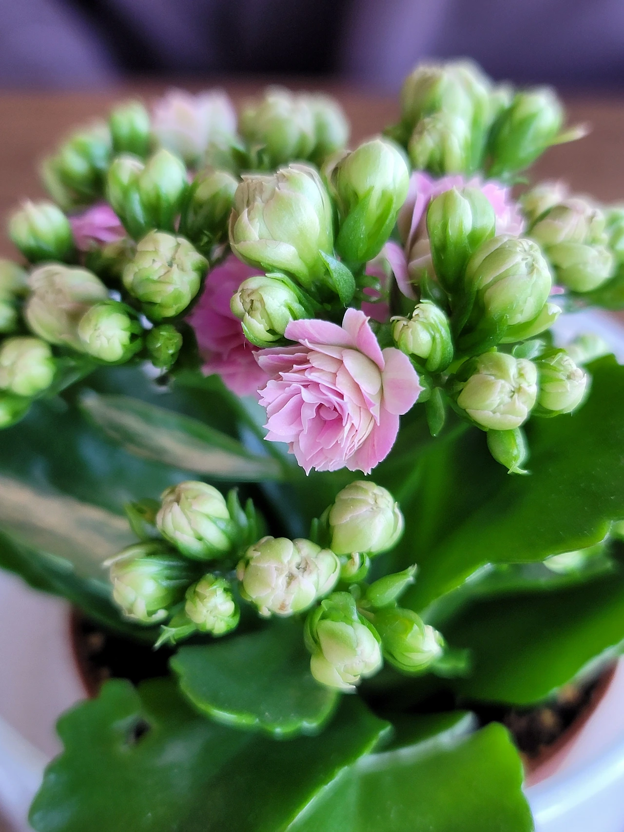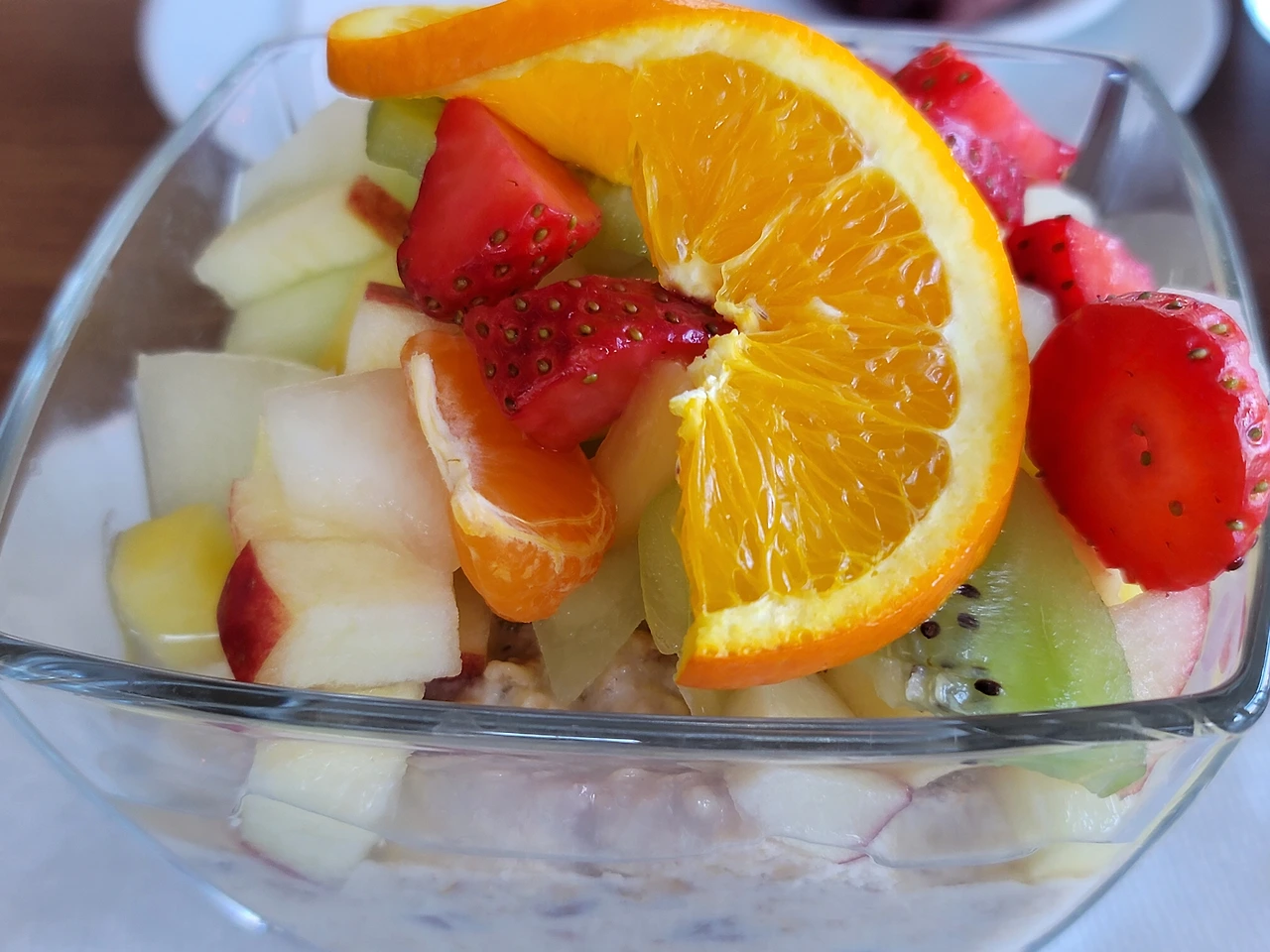 카페의 테이블 위에 핀 봄꽃과 과일 뮤슬리.
