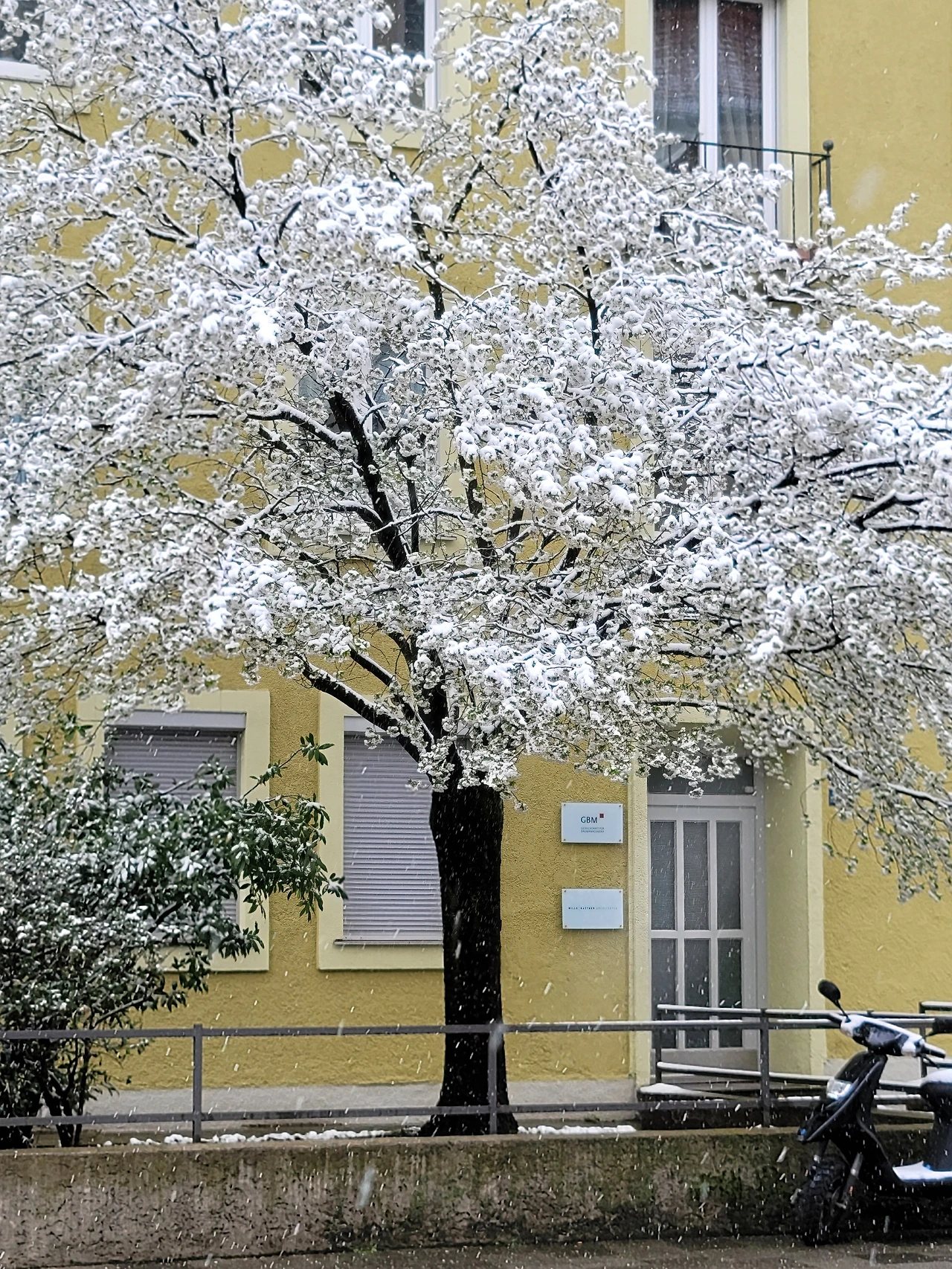 지난겨울 뮌헨은 유난히 따뜻했어요. 4월 초까지 켜 두는 난방을 올해는 2월에 껐으니까요. 3월에는 봄꽃들도 앞다투어 피었어요. 평년보다 조금 빠르다 싶게요. 산수유, 벚꽃, 개나리, 목련. 힐더가드 어머니께서 그러시더라고요. 그래도 4월 날씨는 모른다. 변덕스러운 건 다 사월 날씨에 비유되나 봐요. 아니나 다를까 18도를 웃돌던 날씨는 4월에 들어서자 며칠 동안 5도 아래로 떨어지기도 했답니다. 사월의 첫날엔 비가, 둘째 날과 세째날엔 눈이 내렸지요. 이틀 만에 눈이 얼마나 쌓였는지 아이들은 숲과 잔디 공원에서 눈사람을 만들고 집채만 한 눈덩이를 굴렸어요. 저는 봄꽃들 위로 내려앉은 눈 사진을 찍느라 바빴고요. 만개한 벚꽃 나무 위로 다시 눈꽃이 핀 모습은 하얀 면사포를 쓴 신부만큼이나 순수하고 정갈했답니다.
