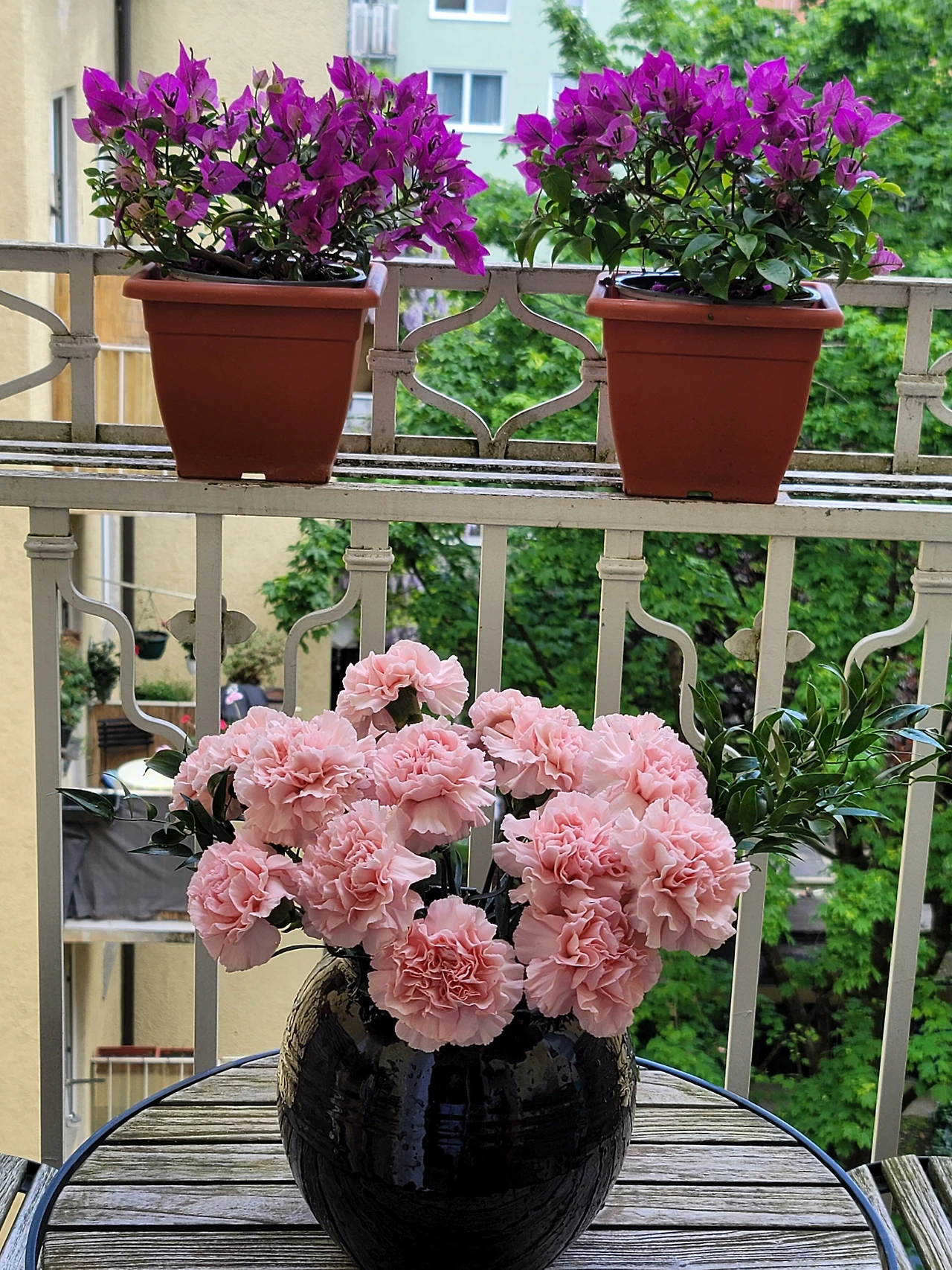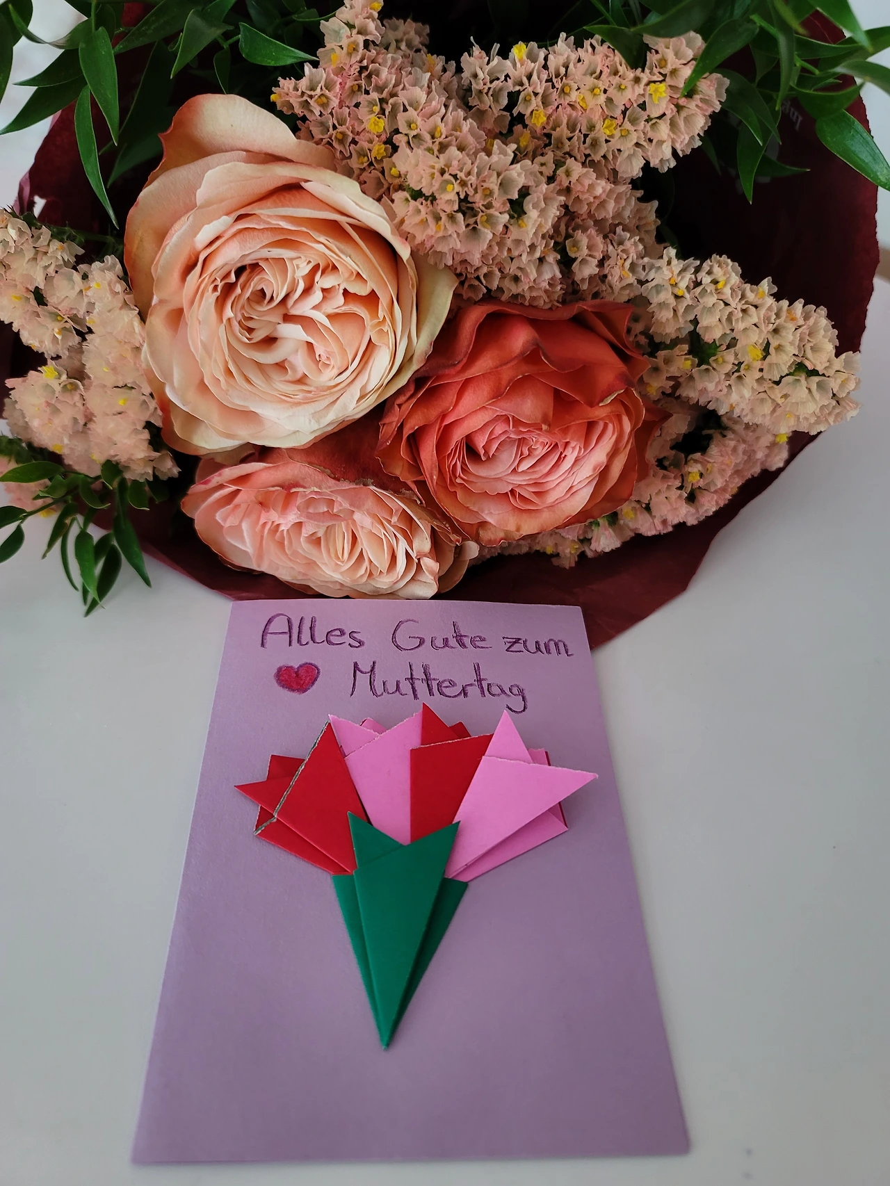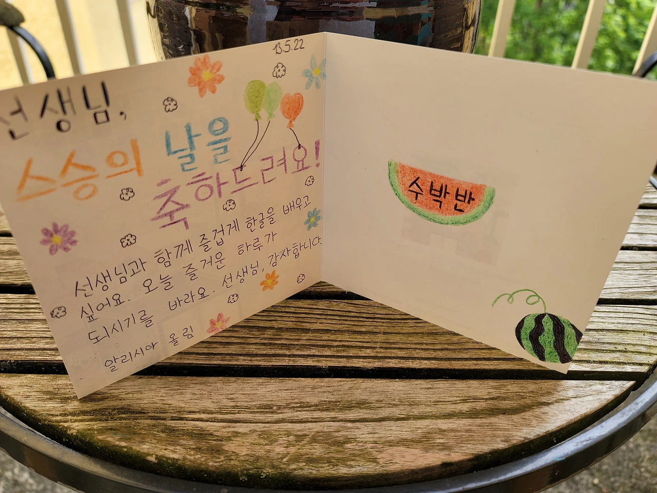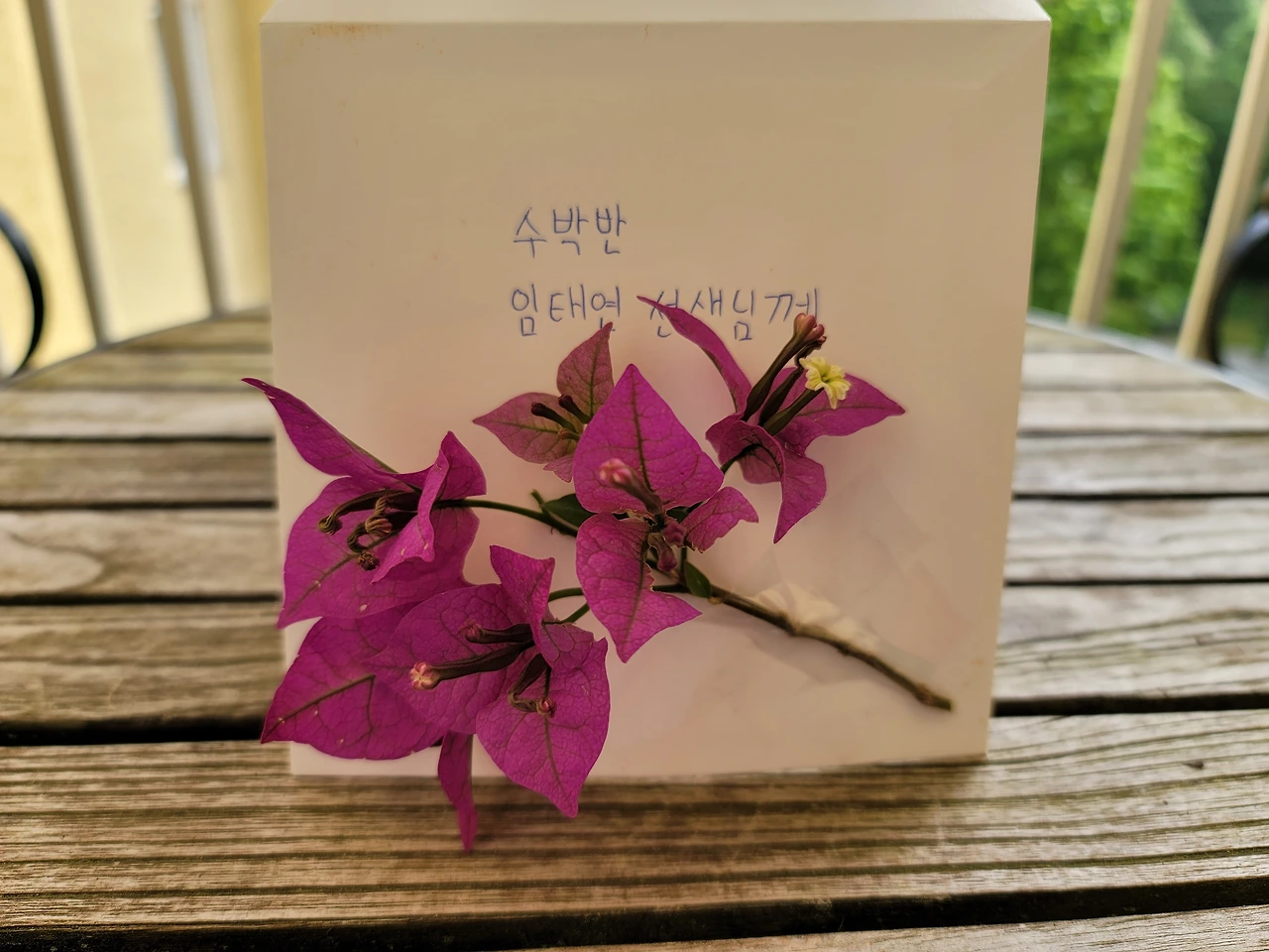 독일에 아버지 날은 없나? 있다. 5/26일. (평일인 줄 알았는데 공휴일이었다!) 어린이날이나 스승의 날? 그런 건 없다. 개인적으로 없어서 너무 좋다. 한국은 이런 날이 너무 많지 않나? 부담이다. 경제적으로 정신적으로. 이런 건 없을수록 좋은 거 같다. 여담인데, 한글학교도 올해부터 학부모들에게 부담을 줄여주었다. 작년까지만 해도 스승의 날이면 각반에서 학부모들이 조금씩 돈을 모아 담임 선생님께 꽃과 작은 선물을 했다. 그런데 올해부터 하지 말라는 공문이 왔다. 그럼 어쩐다? 그래도 스승의 날인데. 아이들이 각자 손카드를 써오는 것도 한 가지 방법인데 호불호가 있을 수 있다. 올해 학부모 반장을 맡은 내가 총대를 매기로 했다. 아이에게 단체 카드를 준비해 가서 친구들과 마무리해서 선생님께 드리라고 하고 학부모들에게도 내용을 알렸다. 봉투에는 어머니날을 맞아 자축하는 의미로 산 부겐빌리아 화분에서 꽃가지 하나를 잘라 꽃다발을 대신했다.