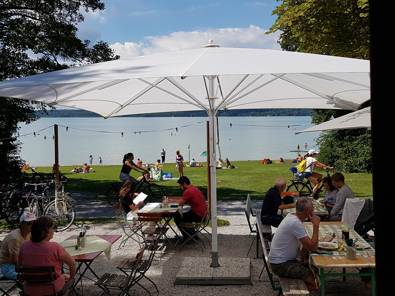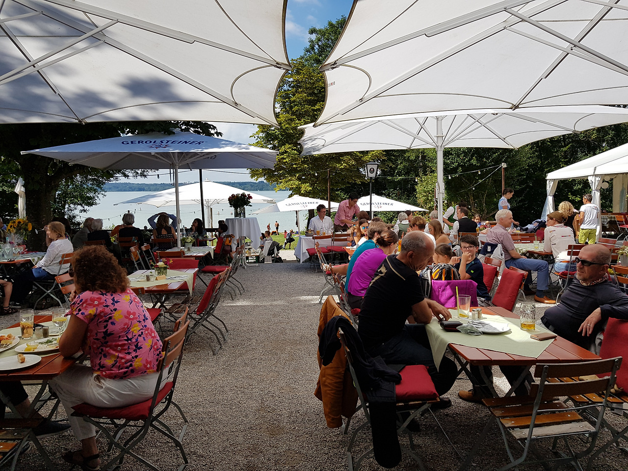 올해는 두 분의 다섯 자녀들만 호숫가 레스토랑으로 초대하셨다. 점심을 먹은 후 레스토랑 앞 잔디에 자리를 펴고 그 자리에서 수영복으로 갈아입고 호수로 뛰어들었다. 한여름 호숫물이 얼마나 차갑던지. 그런데도 벌벌 떨며 따라들어간 건 나 뿐이었다. 용감한 독일 사람들. 시어머니는 새벽 6시면 호수로 가서 수영을 하신다. 뮌헨에서 남쪽으로 차로 30분 호숫가 휴양지이자 뮌헨 중앙역에서 S반으로도 갈 수 있는 이곳 슈탄베르크 Stanberg에 사신 지 30년째 즐기시는 취미다. 매년 6월부터 9월까지. 맨 몸으로 뛰어드신다고. 여기서는 놀랄 일도 아니다. 형네는 3주간 터키로 여름 휴가를 가느라 참석하지 못했다. 그래도 괜찮은 게 독일이다. 나는 이런 문화가 마음에 든다.