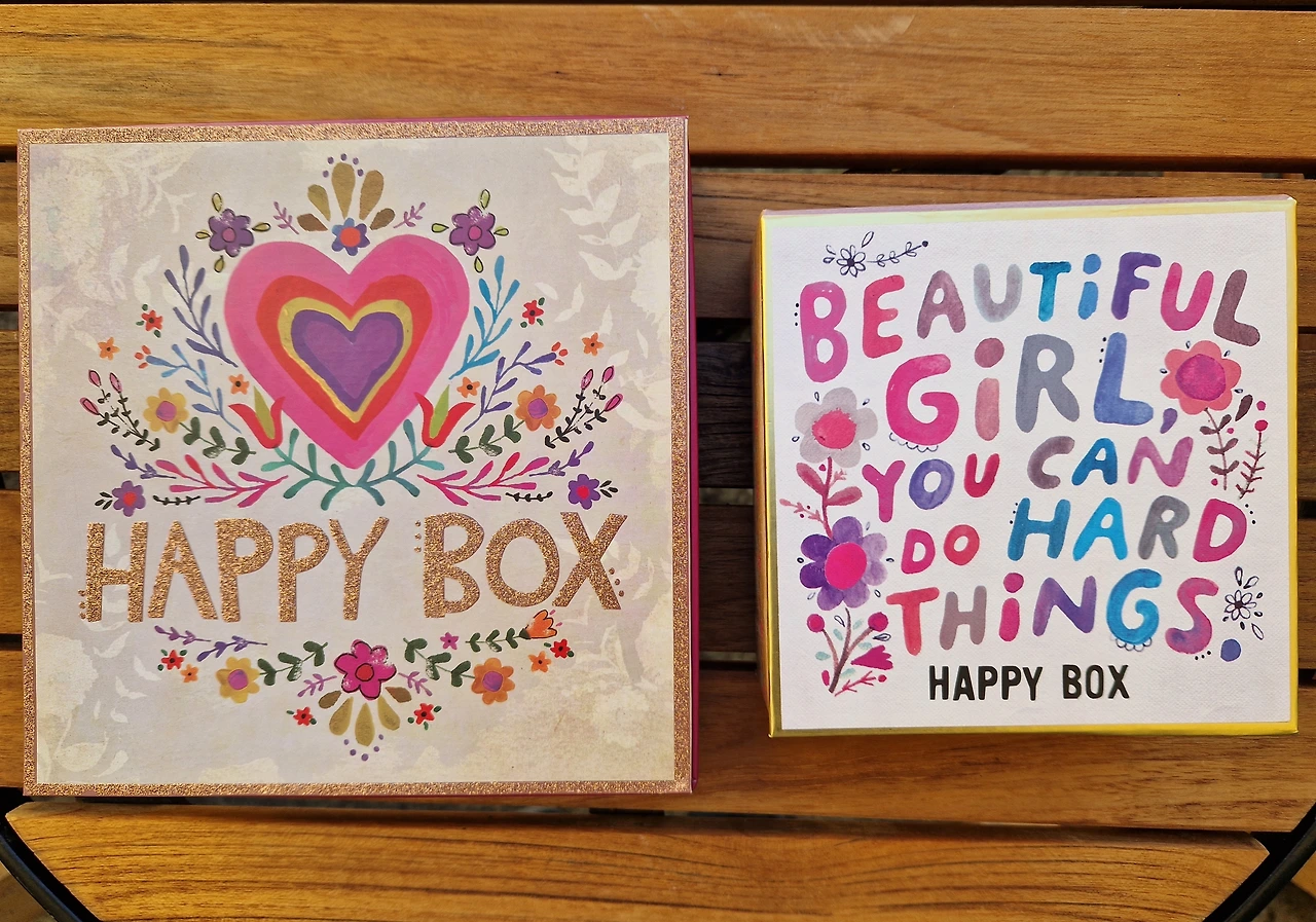 큰 상자는 카타리나 어머니께. 작은 상자는 사춘기가 시작되려는 아이에게. 상자 안은 비밀(왼쪽). 나에게 준 선물은 필통과 파우치. 저 문구를 가슴에 새기며 살 생각이다(오른쪽).