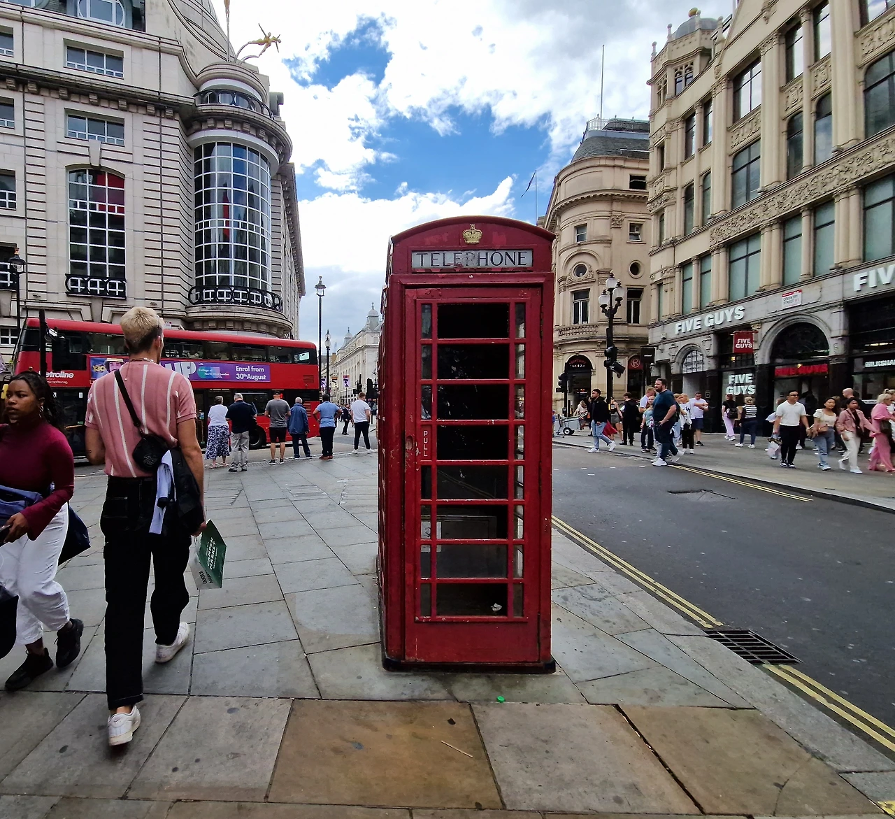 런던의 거리. 공연 티켓 예매소와 뮤지컬 공연장들. 런던의 상징인 버스와 공중전화. 그리하여 런던의 이름은 빨강.