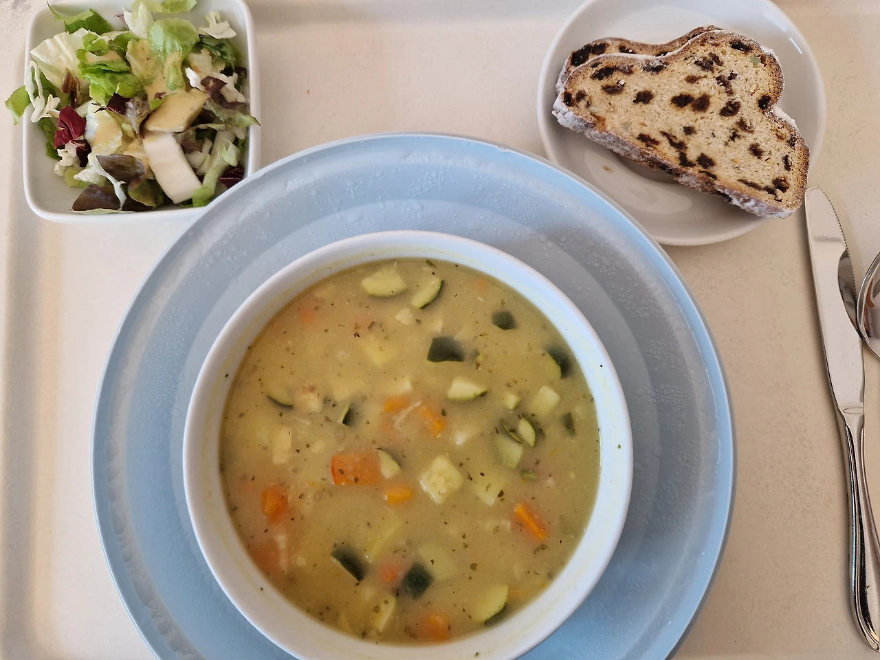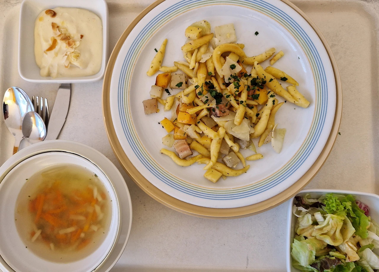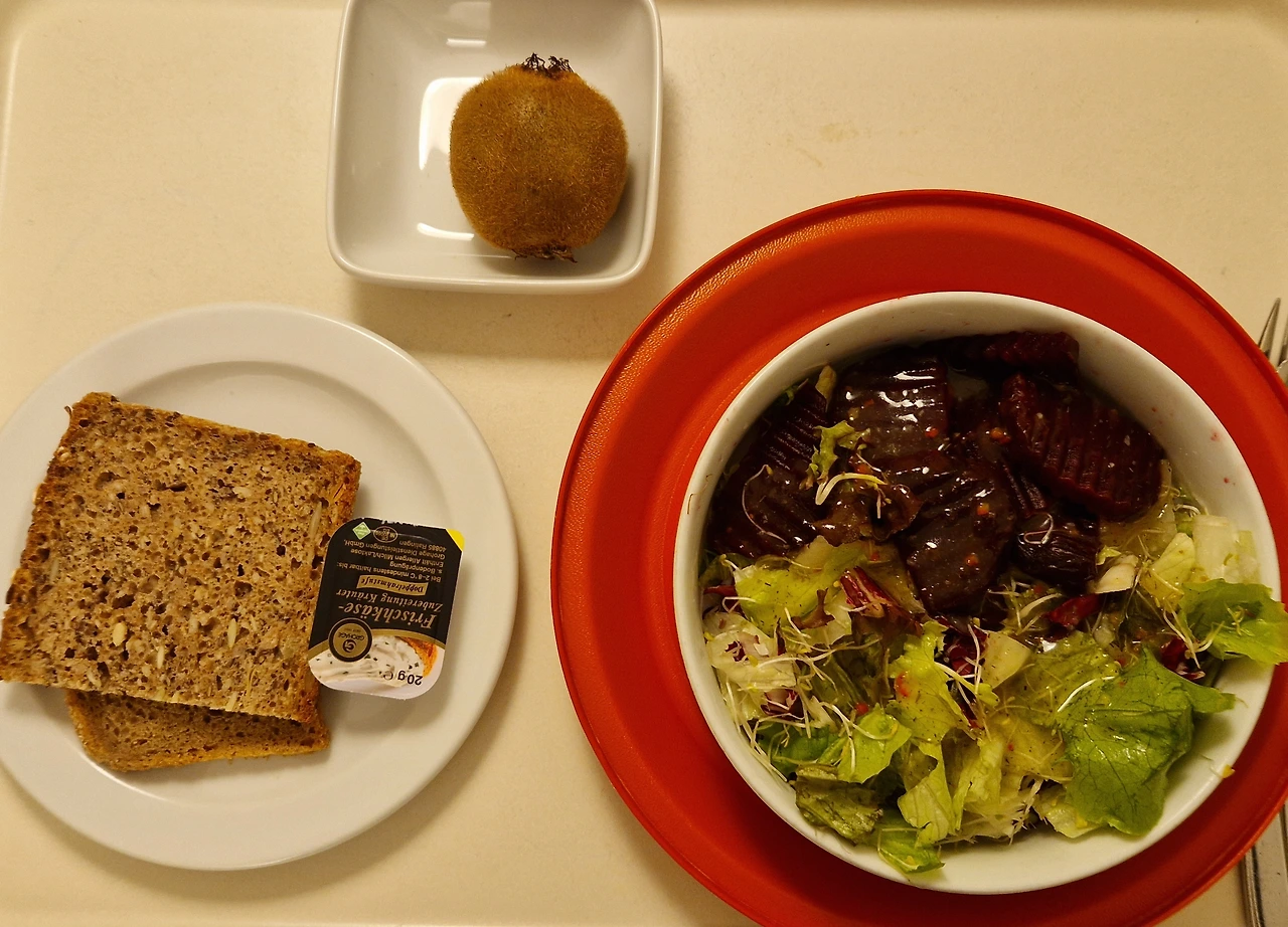 식이 전문가도 내 방을 방문했다. 젊은 수습 여의사 리스아우스 Dr. Liesaus 샘의 추천으로. 식이 전문가가 가장 선호하는 식단이 뭐냐고 묻길래 아침은 뮤슬리와 통밀 잡곡빵, 점심은 따듯한 수프, 저녁은 익힌 야채와 수프와 빵 한 조각이라고 말했다. 첫날 저녁 찬 생샐러드를 먹고 소화가 잘 안 되고 복부에 가스가 차는 느낌이 있었기 때문이다. 그러자 그녀가 나간 후 당장 점심때부터 감자 수프가 대접으로 나왔다. 아, 행복했다! 저녁도 단호박 수프와 익힌 야채와 빵 한 조각으로 완벽했고.
