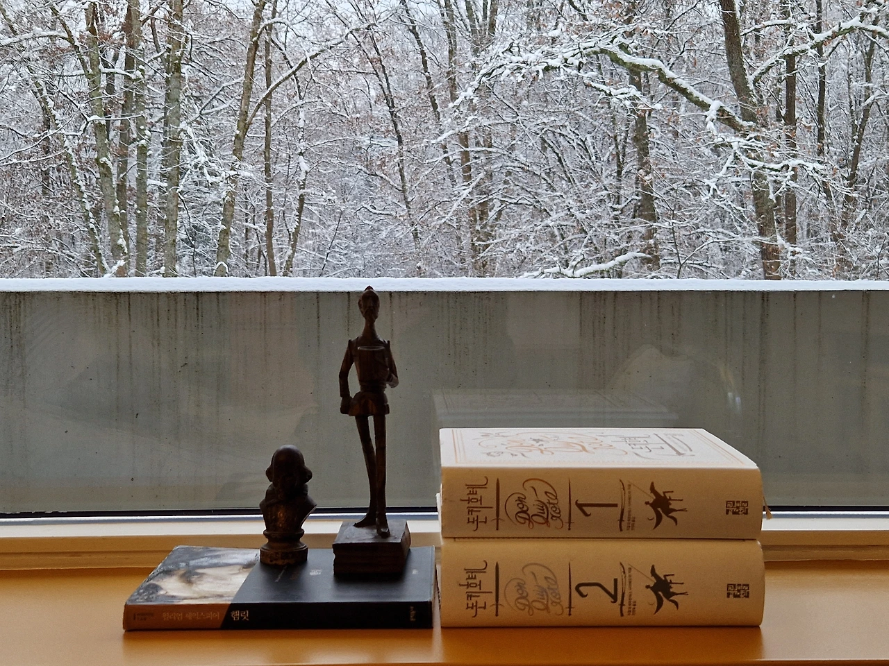 셰익스피어와 돈키호테 혹은 세르반테스를 연상시키는 나무 조각상(위). 눈이 그친 세째날 요양실 창밖의 풍경(아래).