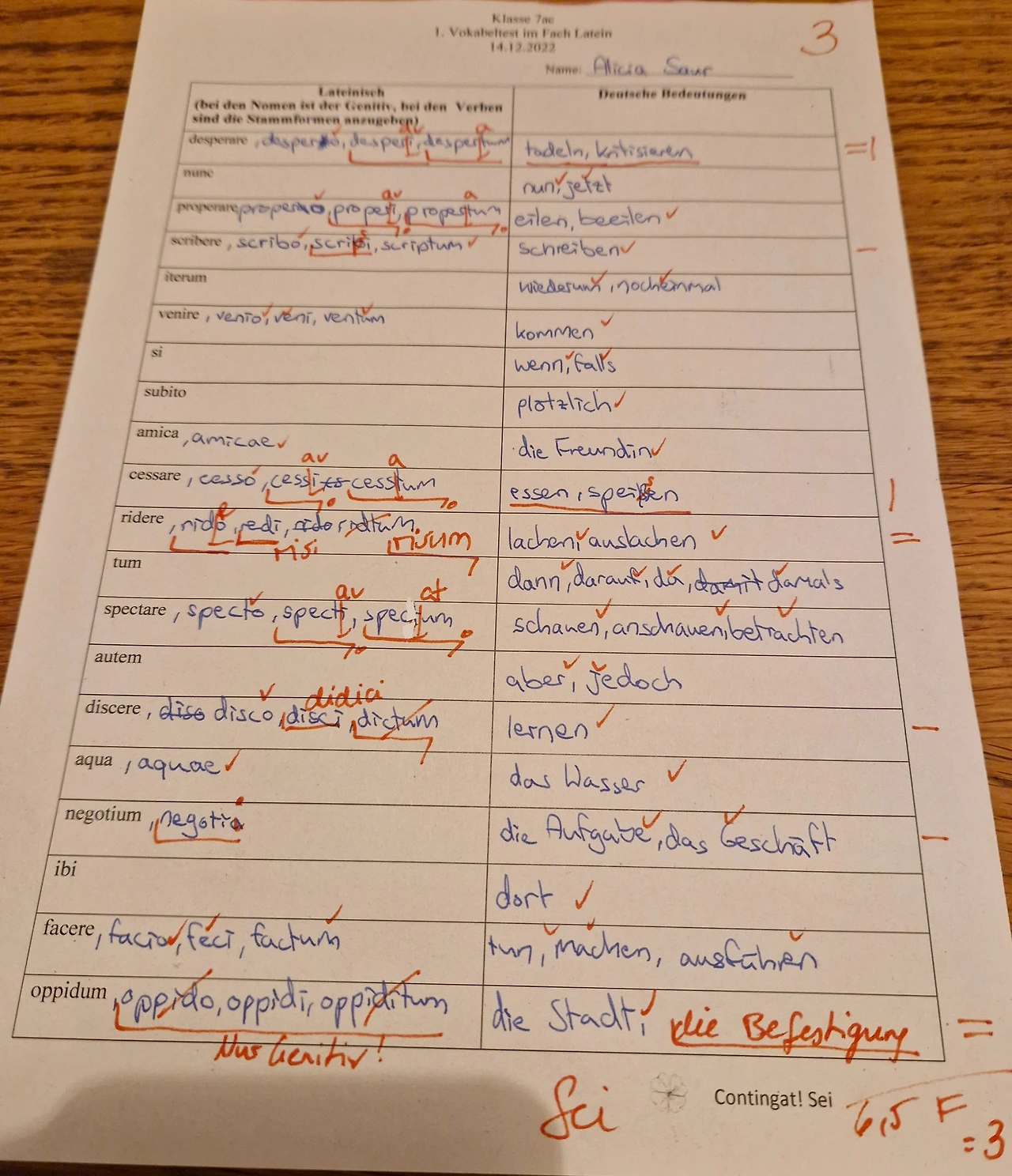 그제는 단어 테스트에 점수 3을 받았다고 흥분해서 학교 마치자마자 전화로 알려주었다. 옛날 라떼로 보자면 딱 미에 해당한다. 그때만 해도 그닥 칭송받을 점수는 아니었는데 현재 아이의 라틴어로는 난공불락의 점수다. 어제는 오랜만에 멀리 남쪽에 사는 아이의 친구 레아마리 맘과도 연락을 주고받았다. 레아마리 맘과 나는 딸들이 라틴어로 힘겨워한다는 공통점을 가졌다. 그러던 레아마리가 단어 테스트에서 점수 2를 받았다는 소식을 듣고 함께 기뻐했다. 당연히 우리 집 숫자도 건너갔다. 다만 아이에겐 아직 친구집 숫자를 알려주지 않았다. 혹시 좌절할까 봐(레아마리야, 정말 잘했어!!!).