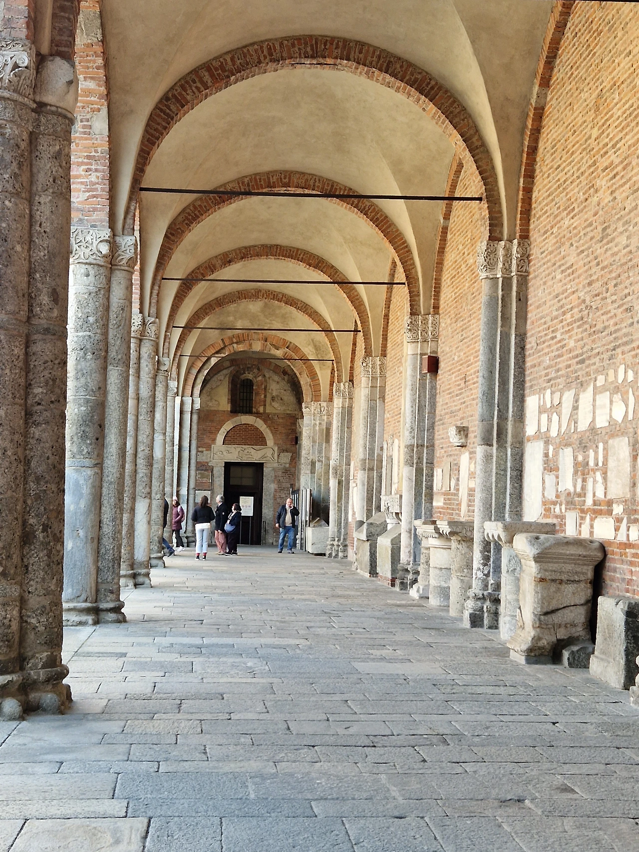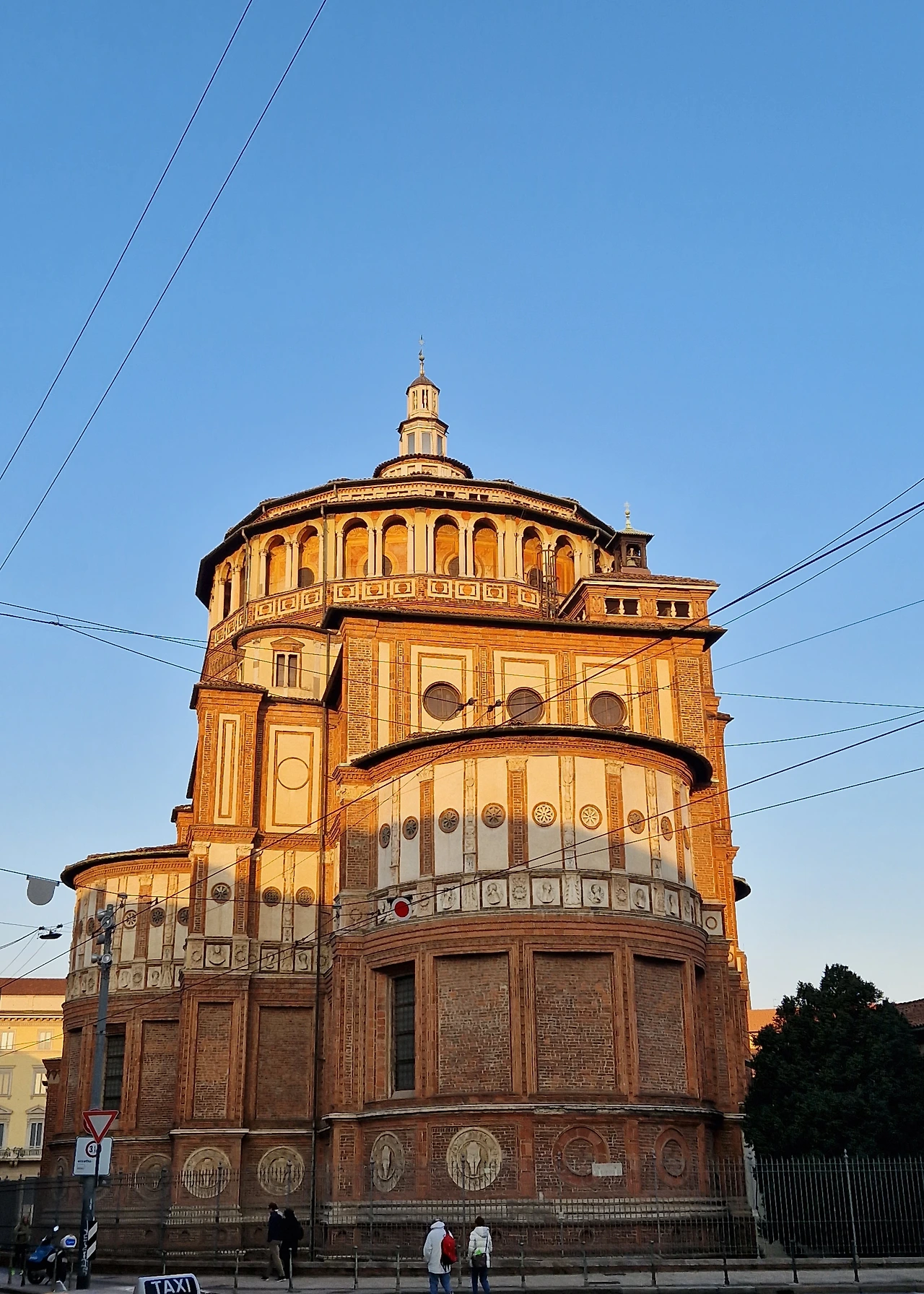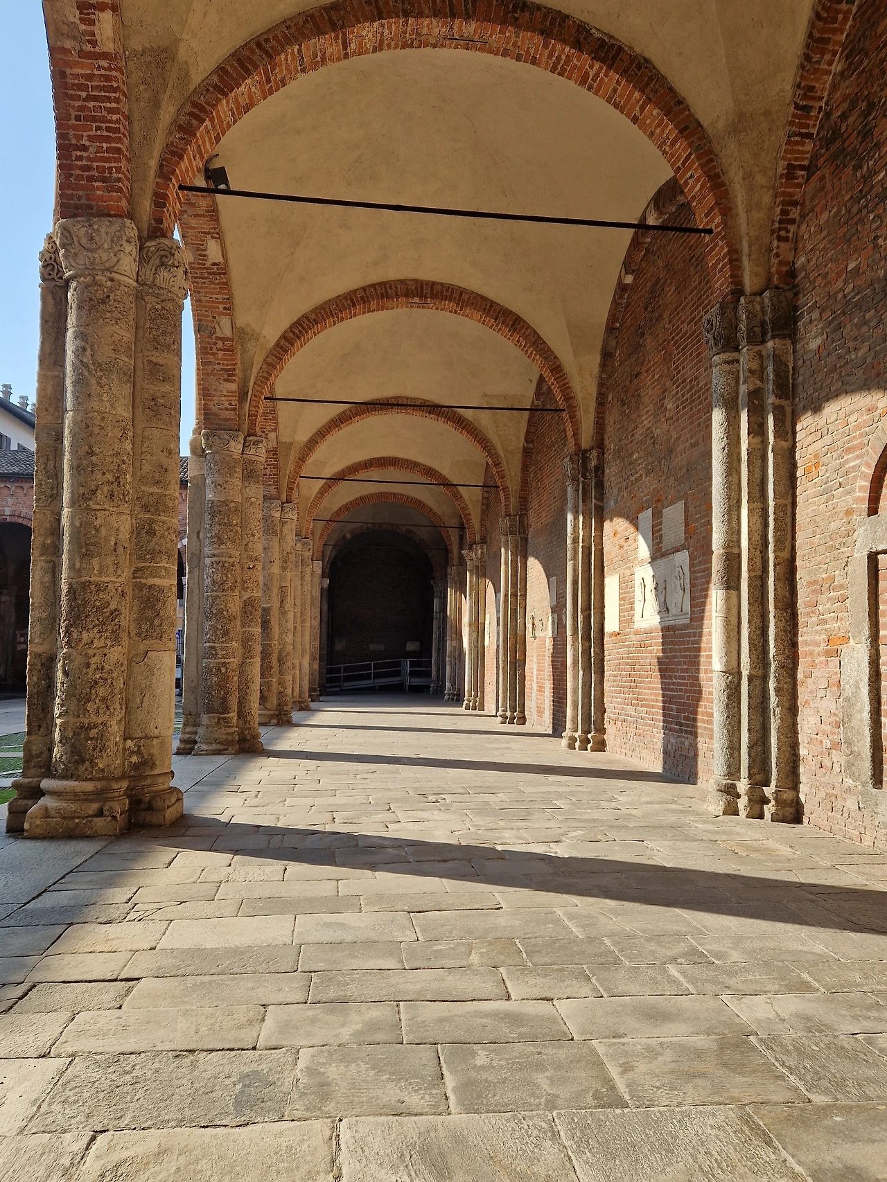 알고 그런 건 아니지만, 내가 예약한 밀라노 호텔 건너편에는 유명한 산타 마리아 델라 그라치에 성당도 있었다. 아는 분은 아시겠지만, 이 성당이 왜 유명하냐면 최후의 만찬 그림이 있기 때문이다. 레오나르도 다 빈치(1452-1519)의 진짜 그림. 이 작품은 산타 마리아 수도원 식당에 걸려 있다고. 나는 일요일 아침 미사가 열리고 있는 성당 내부를 잠시 보았을 뿐 이 그림은 못 봤다. 예약을 못해서. 다시 밀라노를 간다면 보겠지. 일요일 오전에는 한 군데 성당을 더 보기로 했다. 암브로시아 성당. 여기도 호텔에서 멀지 않았다. 미사 중인 성당에 들어가 잠시 앉았다 나왔다. 햇살이 내리쬐는 성당 밖의 회랑도 평화로웠다. 시간이 없어서 암브로시아 미술관은 못 봤다. 다시 온다면 가 볼 곳이 또 있다. 밀라노 스포르체스코 성 미술관. 시립 미술관으로 미켈란젤로의 피에타 중 미완성작인 '론다니니의 피에타'가 있다고. 호텔에서 가까운 까도르나 Cadorna 메트로 역에서도 성이 보였다. 이 정도면 호텔을 고른 안목만은 신급이라 우겨도 될 만..