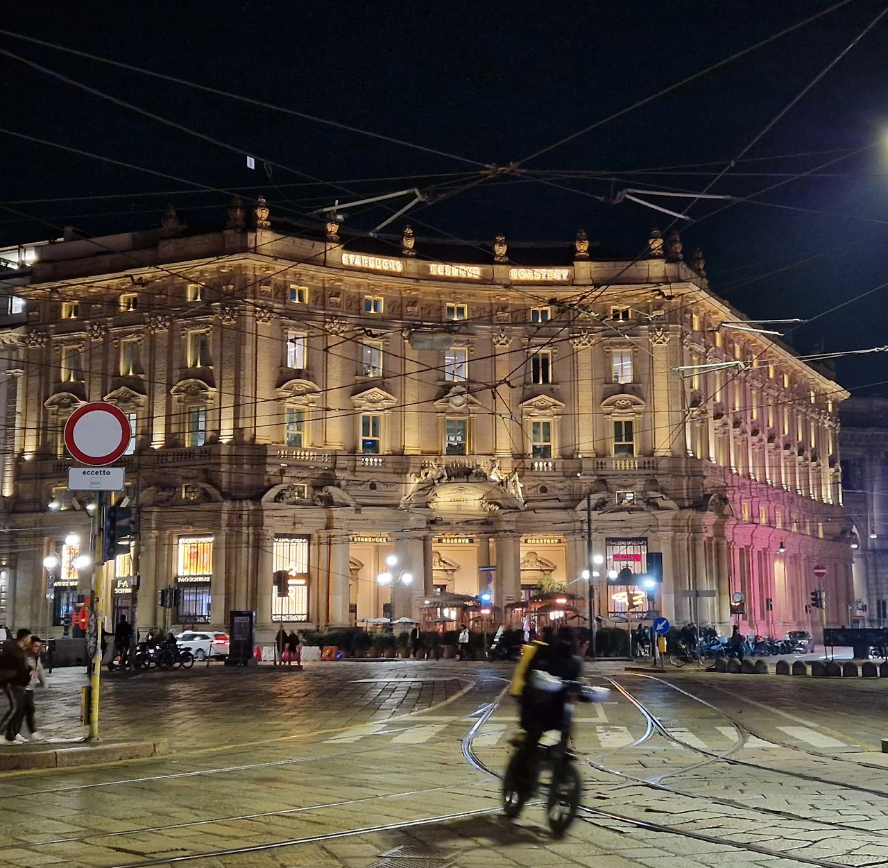 저녁도 먹었겠다 바로 호텔로 돌아가긴 서운해서 밤 야경도 볼 겸 밀라노 시내를 걸었다. 달은 밝았다. 그 밤에 사람들은 왜 그리 많던지. 밀라노 두오모를 배경으로 달빛에 취하고, 광장 왼쪽에는 기타 소리와 노랫소리와 떠들썩한 박수 소리. 두오모 광장의 공기도 포근했다. 내 희망은 윤찬 공연을 보고, 환호하고, 저녁을 먹고, 와인을 마시고, 기분 좋게 취해서 밀라노 밤거리에서 버스킹 한 번 해보는 거였는데 다 물 건너 감. 뭐 그렇다는 거다. 아쉽지만 아쉽지 않으면 여행이 아니고 인생이 아니지. 아쉬운 마음은 5월 뮌헨에서 있을 조성진 공연으로 채워야겠다. 그의 헨델과 모차르트와 쇼팽으로. 언젠가는 윤찬도 오겠지. 기다림이 행복이라는 말은 맞다. 낭만적으로 밤거리를 달리는 트람도 보고, J의 안내로 문 닫기 직전 밀라노에서 그 유명하다는 로스터리 카페 스타벅스 리저브에도 들렀다. 다음날 아침엔 거기서 커피도 마셨는데 J언니들 두 분도 마음에 쏙 들어하시고.
