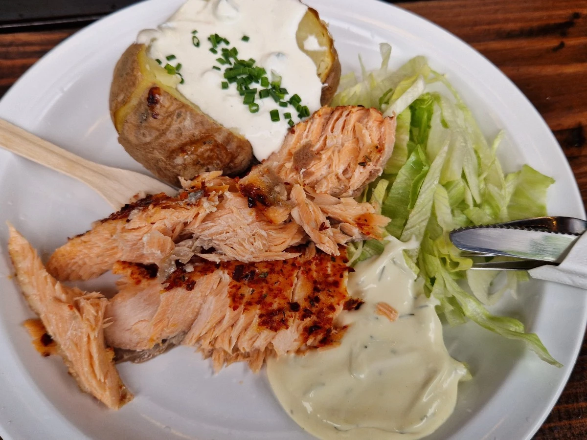 아우둘트의 생선구이와 연어구이. 아래쪽은 찐빵과 연어구이 세트 메뉴와 크래프.