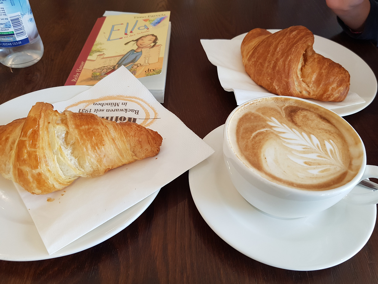 나는 카푸치노와 플레인 크라상, 아이는 생수와 초콜릿 크라상, 남편은 카페라테와 햄&계란 메뉴를 주문했다. 가격은 총 17유로(19,000원 정도). 이 정도면 부담 없는 주말 브런치다. 베이커리 카페는 대체로 셀프라 팁도 필요 없다.