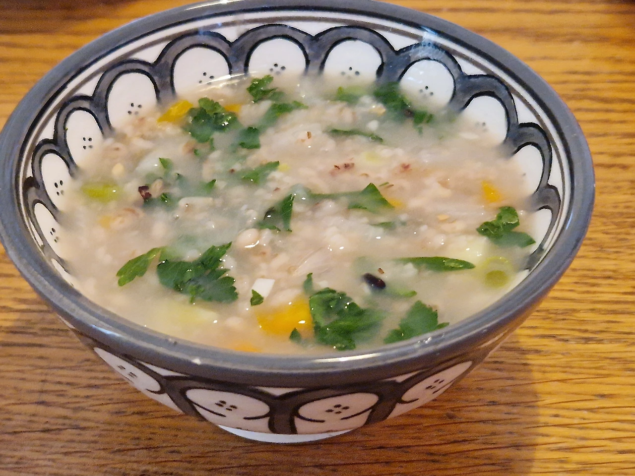항암을 위한 준비는 팔 할이 음식이겠다. 나는 무척 간략한 전술을 짜고 있어서 마음의 부담은 적은 편이다. 항암 이틀 전인 주말과 항암 당일인 월요일까지 보리 잡곡죽만 먹는 <사흘 항암 단식>을 실천해 보려고 한다. 죽도 먹고 신선한 채소와 과일도 곁들이니 단식이라고 말하기도 쑥스럽지만 편의상 이렇게 부르기로 하자. 나의 죽 레시피는 정말 쉽다. 잡곡에 보리를 섞어 밥을 한다. 끓인 보리차에 보리 잡곡밥을 넣고 죽을 끓인다. 여기에 잘게 썬 채소를 넣는다. 처음이라 집에 있는 채소를 거의 다 넣어봤다. 감자, 양파, 파, 마늘, 당근, 무, 파슬리. 아쉬운 건 셀러리가 없다는 것. 다음엔 셀러리도 넣어보려고 한다. 서양 채소 수프의 3대 기본이 양파, 당근, 셀러리라는 걸 유튜브에서 배웠기 때문이다. 맛? 일품이었다. 아이도 먹고 싶다고 해서 아이에겐 따로 덜어서 간장과 참기름으로 간을 맞춰주고 김치도 곁들여주었다. 나는 간을 일절 하지 않고 먹었다. 그래도 맛있었다. 채소에서 우러나오는 풍미란 게 있잖나. 착각인지는 몰라도 채소와 잡곡만 든 보리죽인데도 고소한 맛이 났다. 남편과 아이가 주말 죽 프로그램에 동참해 준다면 가사 노동이 훨씬 수월해질 것 같다. 죽만 더 끓이면 되니까. 단식 첫날은 아침에 과일과 채소를 먹었고, 점심과 저녁에 죽을 먹었다.