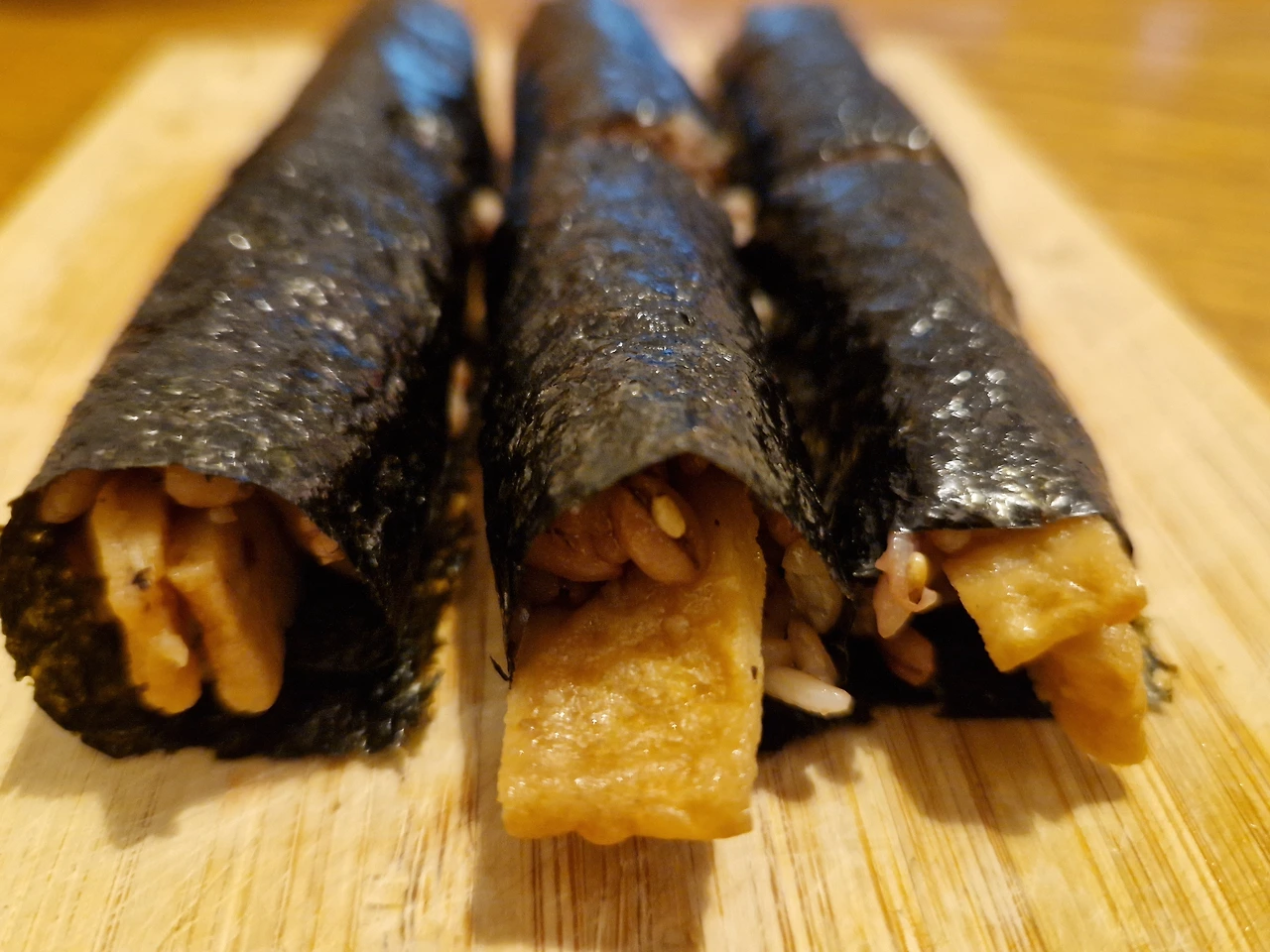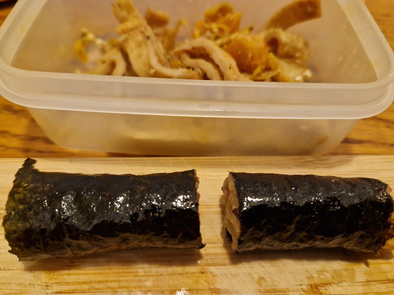 일본 미소 된장과 항암 사흘 단식 후 먹을 무생채(위). 죽 단식 중에 먹어 버린 매콤 어묵 꼬마 김밥(아래).