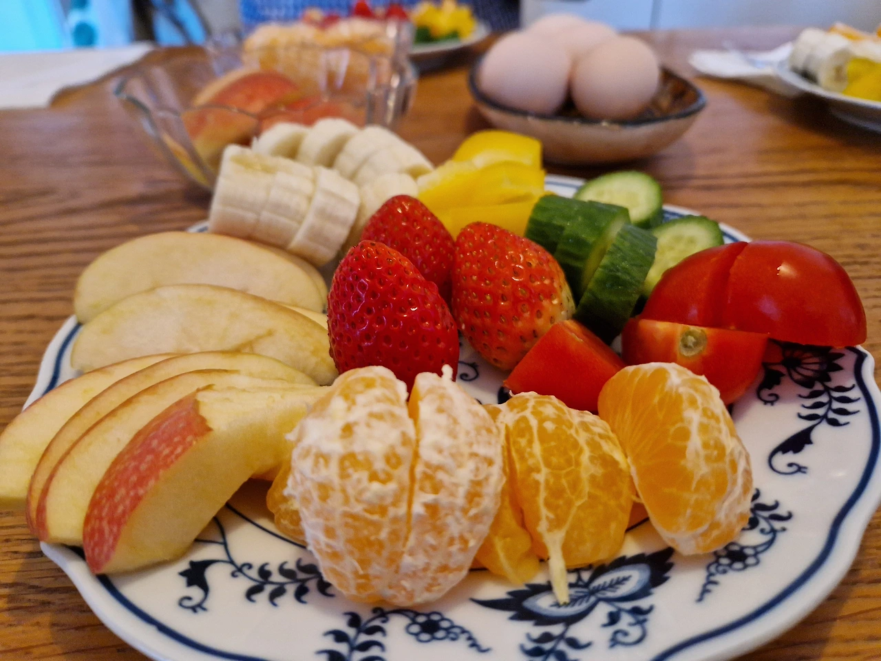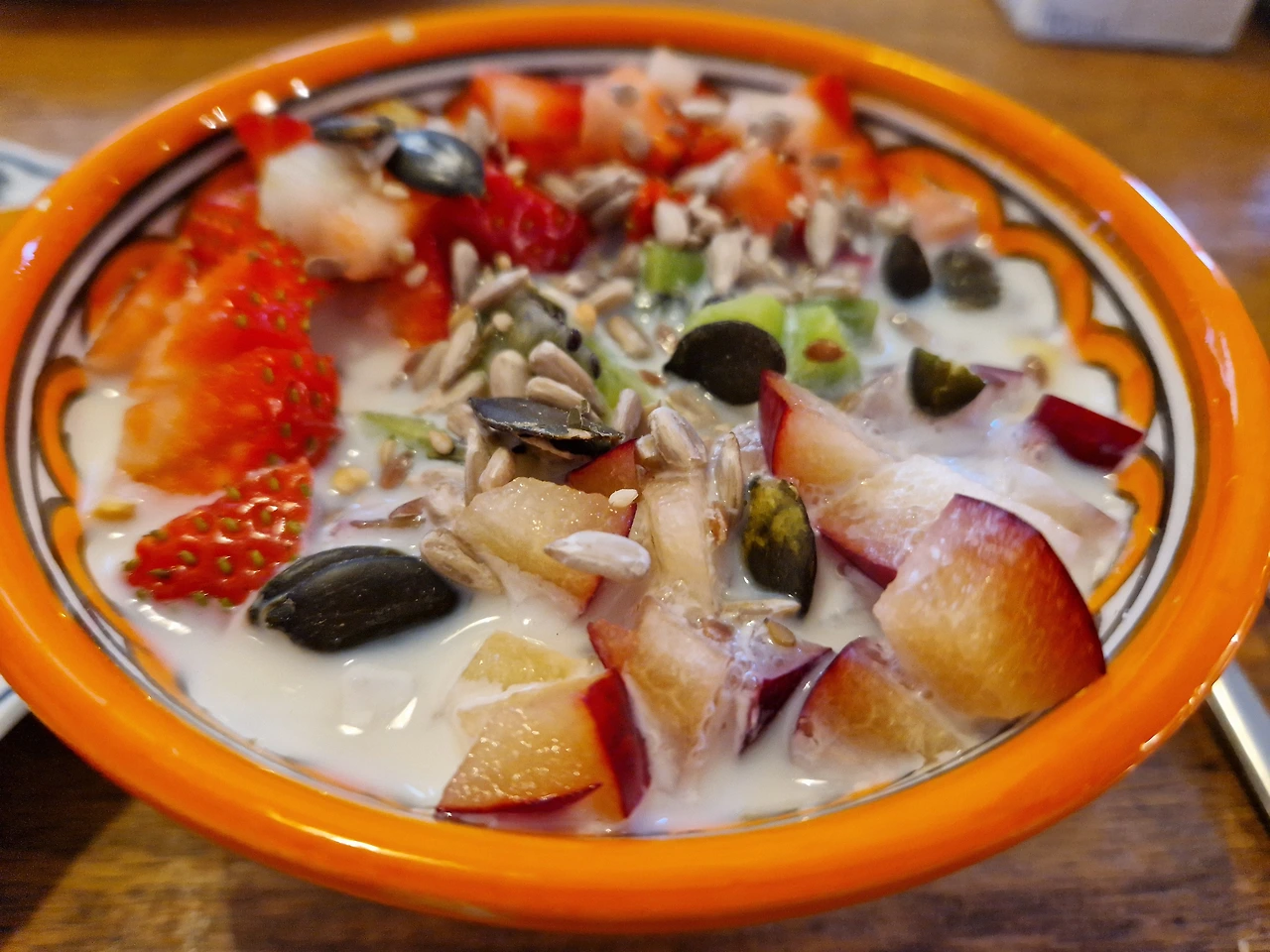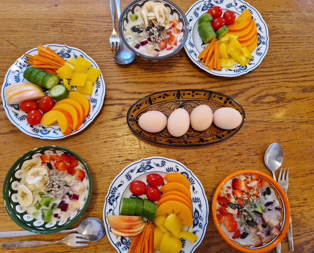 퇴원 후 첫날과 둘째날의 아침 식사. 신선한 과일/야채/삶은 계란과 뮤슬리. 뮤슬리엔 과일/견과류/두유를 넣었다.