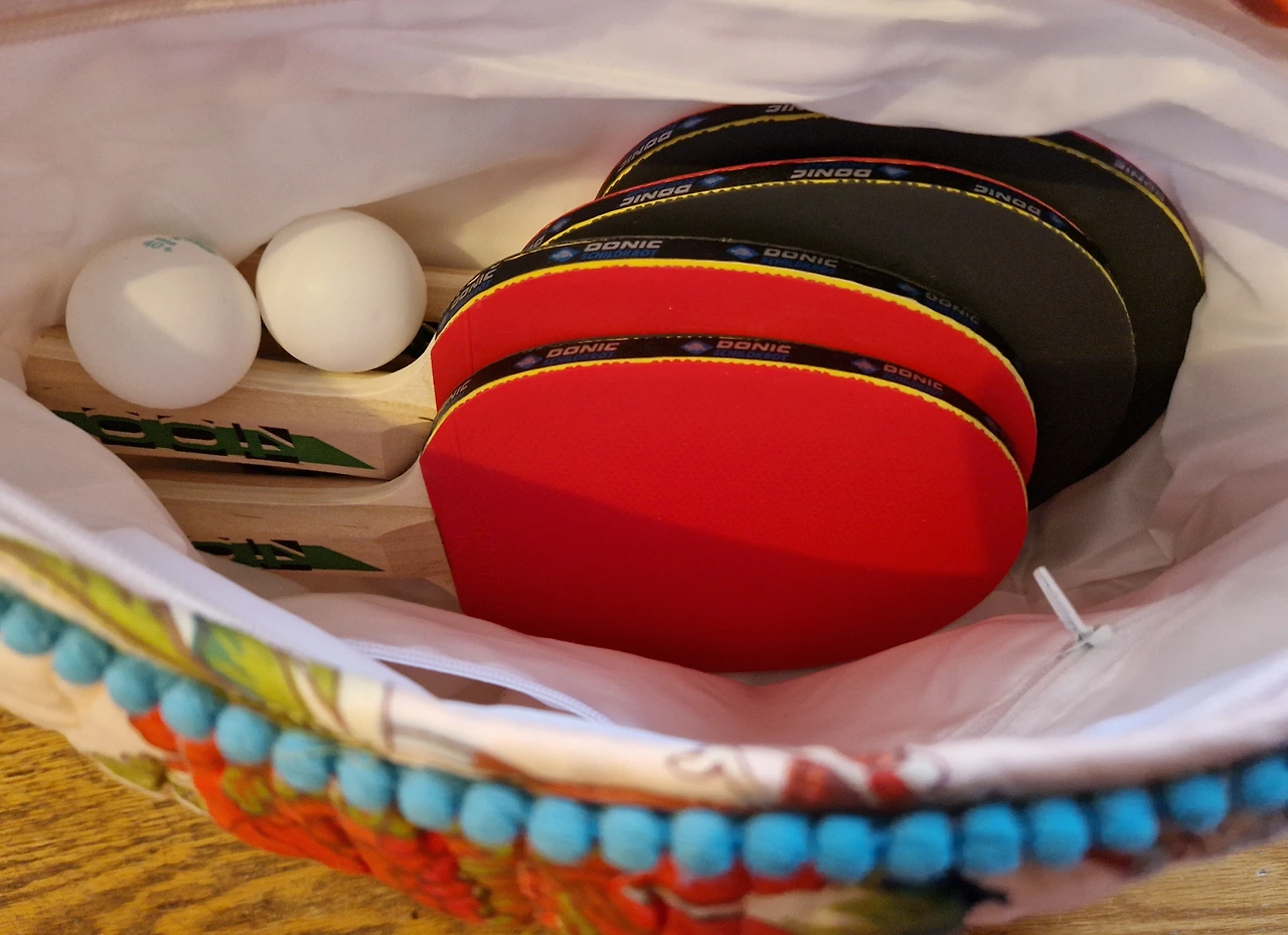 새로 산 탁구채 4개와 탁구공 6개.