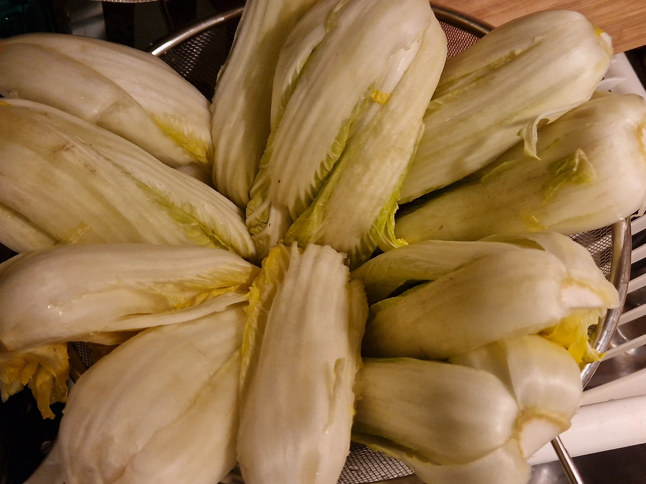 우선 배추 절이기. 천일염을 적당히 푼 소금물에 켜켜이 소금을 조금씩 뿌린 배추를 5-6시간 절이고 물을 뺀다. 배추를 절일 때는 짜지 않도록 주의했다. 살짝 씻을 때 맛을 보니 안 짜고 괜찮았다. 양념은 어떻게? 이것도 내 맘대로다. 중요한 건 양념 역시 너무 간이 세지 않도록 하는 것. 생김치로 먹어도 짜거나 맵지 않도록. 비율도 대충대충 했다. 물을 끓여 한 김 식힌 후 찹쌀가루 한 스푼 반을 넣고 풀었다. 계량은 쌀컵으로 했다. 고춧가루 1컵, 멸치액젓 1컵(까나리 액젓이 없어서!), 설탕 2스푼(설탕을 안 넣으니 짜고 맵고, 대신 넣을 매실청도 없어서), 마늘 10쪽(생강은 없어서 생략!), 귤과 사과도 썰어 넣었다. 최종 간을 보니 괜찮았다. 김치통 바닥에 무를 깔고 양념 조금 버무림. 그 위에 잔파를 올리고 양념 조금 버무림. 맨 위에는 절인 배추를 한 포기씩 올려 양념 대충 묻혀 차곡차곡 쌓기. 배추김치 담그기 끝.(이번 배추김치는 역대급으로 쉬웠다!)