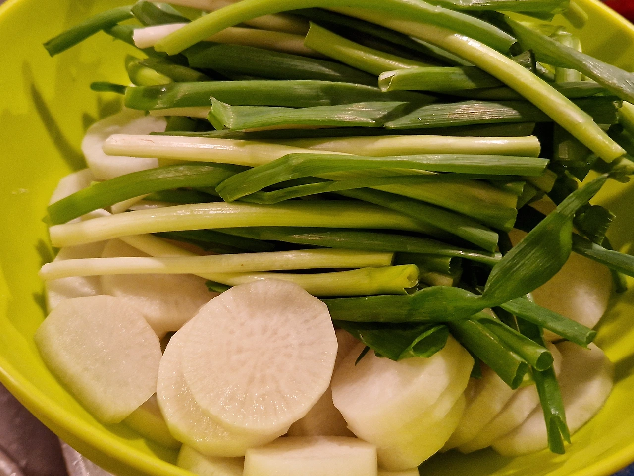 귀한 잔파와 무. 사진에서는 커 보이지만 일반 독일 마트에서 파는 파보다 굵기가 가늘다. 무는 바람이 조금 들었지만 그대로 담갔다.