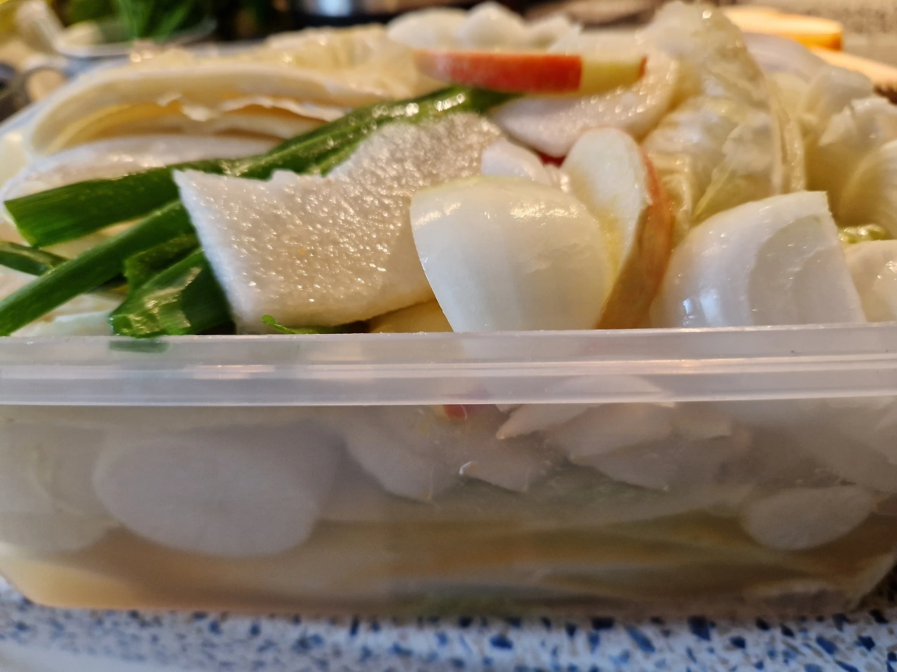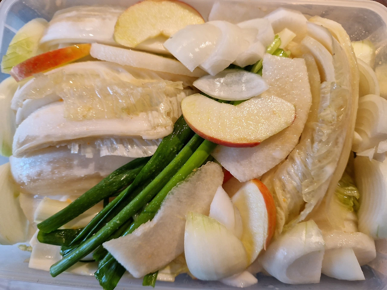 무와 양파가 익을 게 기대되는 백김치. 간이 슴슴해서 다 담근 후 멸치 액젓을 한 숟갈 추가했다.