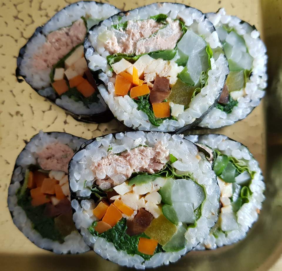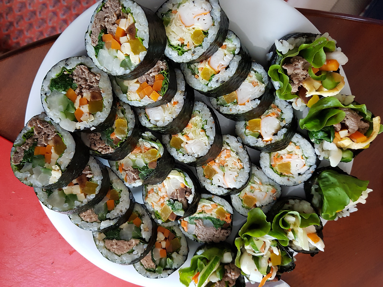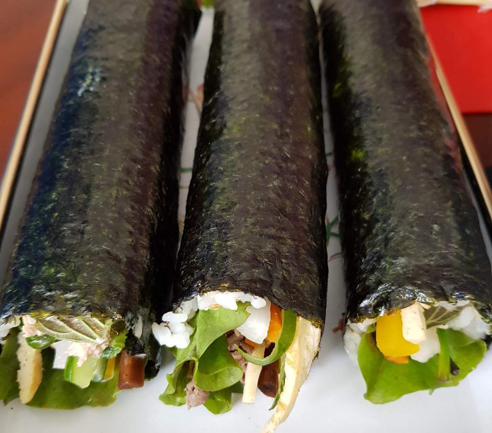그야말로 배가 터지게 먹었다. 김밥이 얼마나 뚱뚱한지 하나만 집어먹어도 입 안이 꽉 차는 것도 마음에 들었다. 김밥은 이래야 한다. 날씬하면 못 쓴다. 더 마음에 든 건 Y의 매너였다. 테이블 위에 김밥 재료를 세팅한 후 즉석에서 말고 썰어서 한 입씩 맛보게 했다. 샐러드 김밥, 소고기 김밥, 참치 김밥, 세 가지 다 얼마나 맛있던지 우리는 냠냠 소리도 낼 새 없이 써는 족족 냉큼 집어먹었다. 양도 충분했다. 김밥을 실컷 먹고 테이블을 정리하고 재세팅 후 정식으로 점심을 먹었다.