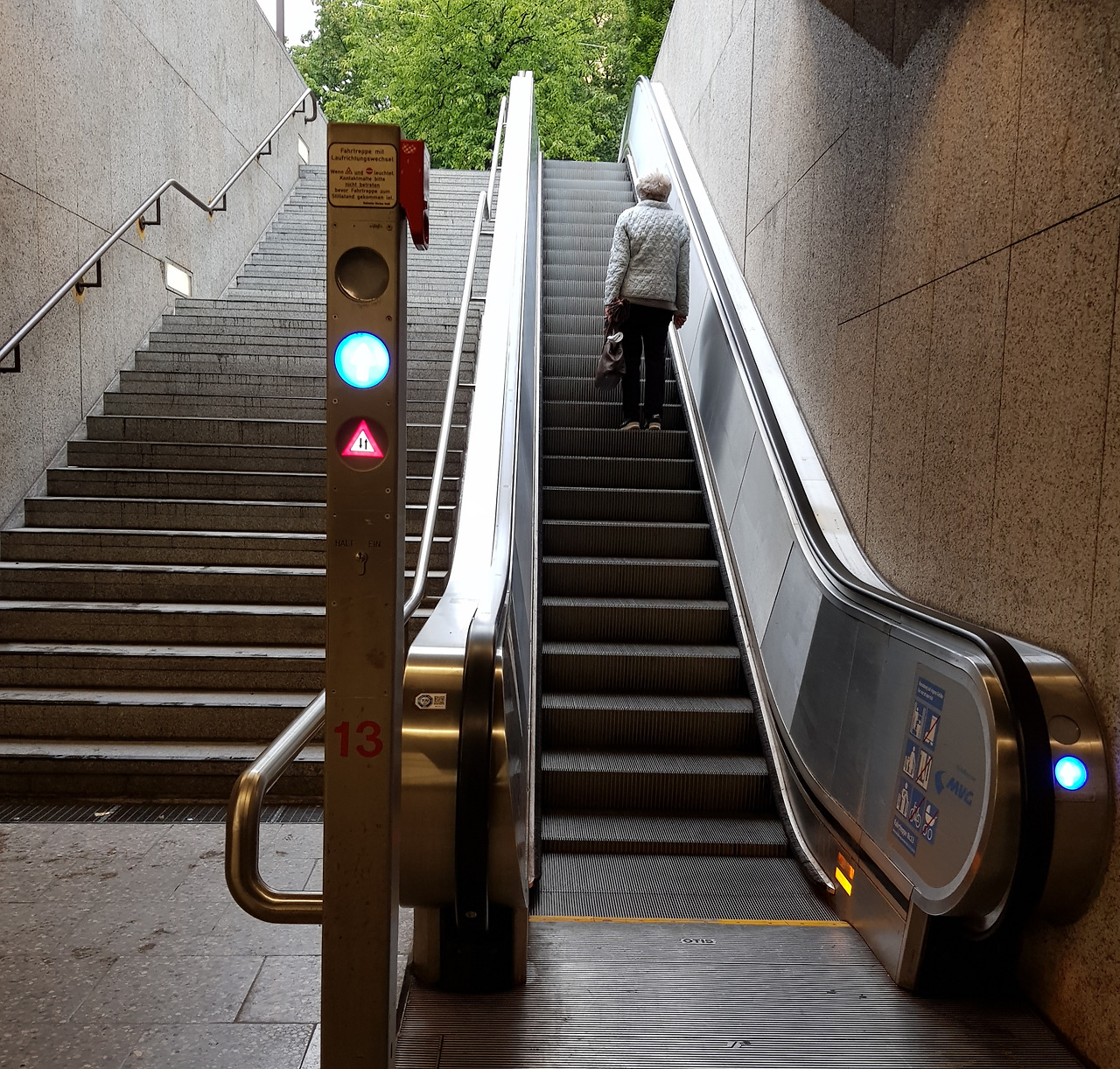 거의 모든 역사에는 엘리베이터와 에스컬레이터가 설치되어 있다. 출구가 여러 곳이어도 대부분 에스컬레이터가 있어 편리하다. 많은 에스컬레이터가 양방향이 가능한 센스 기능을 갖추고 있다. 예를 들면 에스컬레이터 하나로 올라가기도 하고 내려가기도 한다. 인구가 적절해서 가능한 시스템인 듯. 타는 사람이 없을 땐 저절로 멈추어 있다가 사람이 오면 가까운 쪽부터 움직이기 시작한다. 우리 동네만 해도 네다섯 출입구에 모두 에스컬레이터가 설치되어 있는데 신기한 건 비가 와도 잘 작동한다는 것.