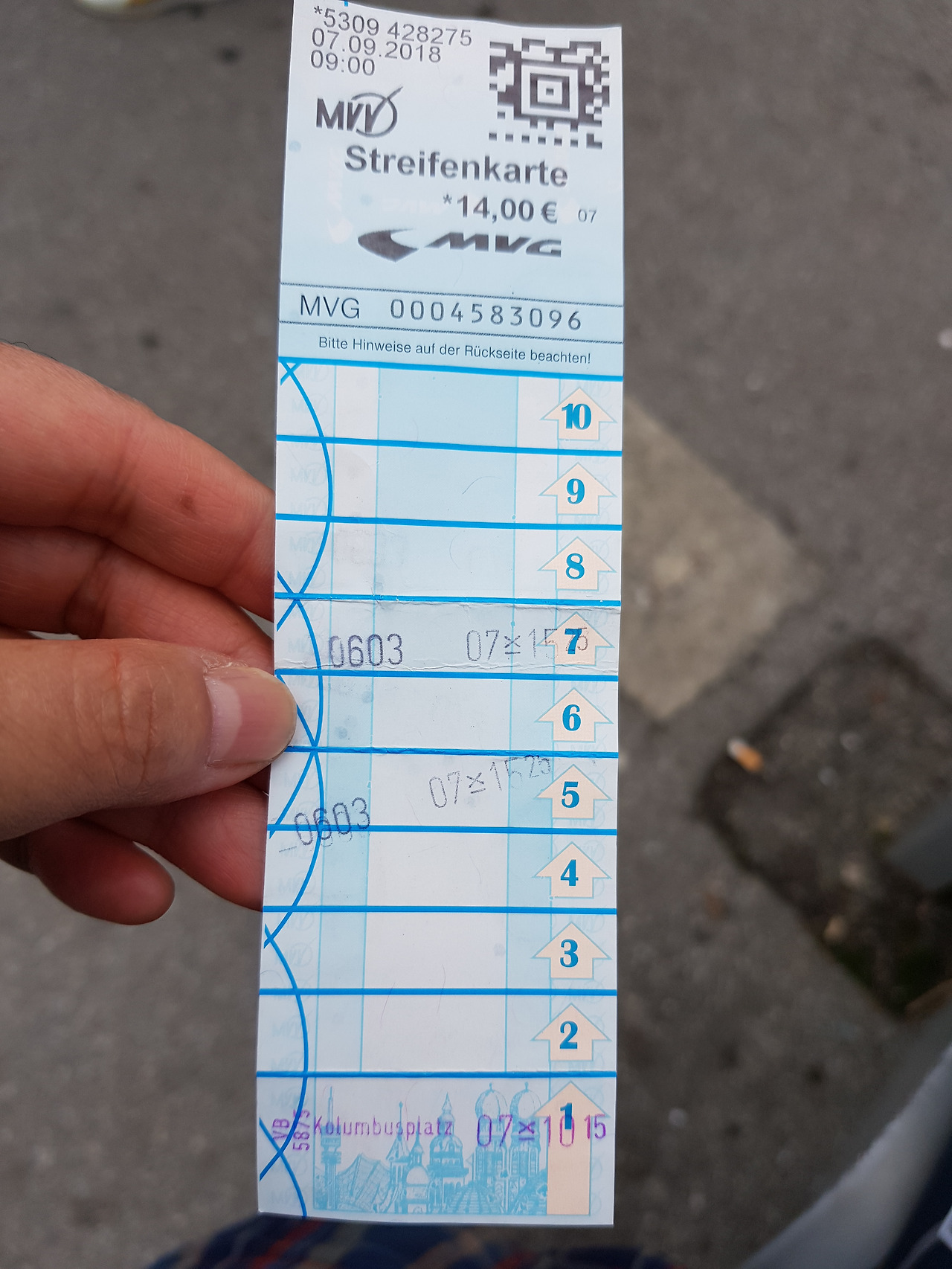 알리시아 고모 바바라 역시 어느 날 S반을 타고 시외 외곽으로 나갔다가 밤늦게 돌아오던 날 검표원에게 걸렸다. 뮌헨 시내에서만 사용하는 월정액 표를 사용하는 사람은 시외로 갈 때 10회권을 사서 정해진 만큼 티켓 기계에 출발지 역명을 꼭 찍어야 한다. 늦은 시간이라 방심하고 안 걸릴 줄 안 모양이었다. 독일 사람들도 걸린다는 걸 알고 조금 놀랐다.