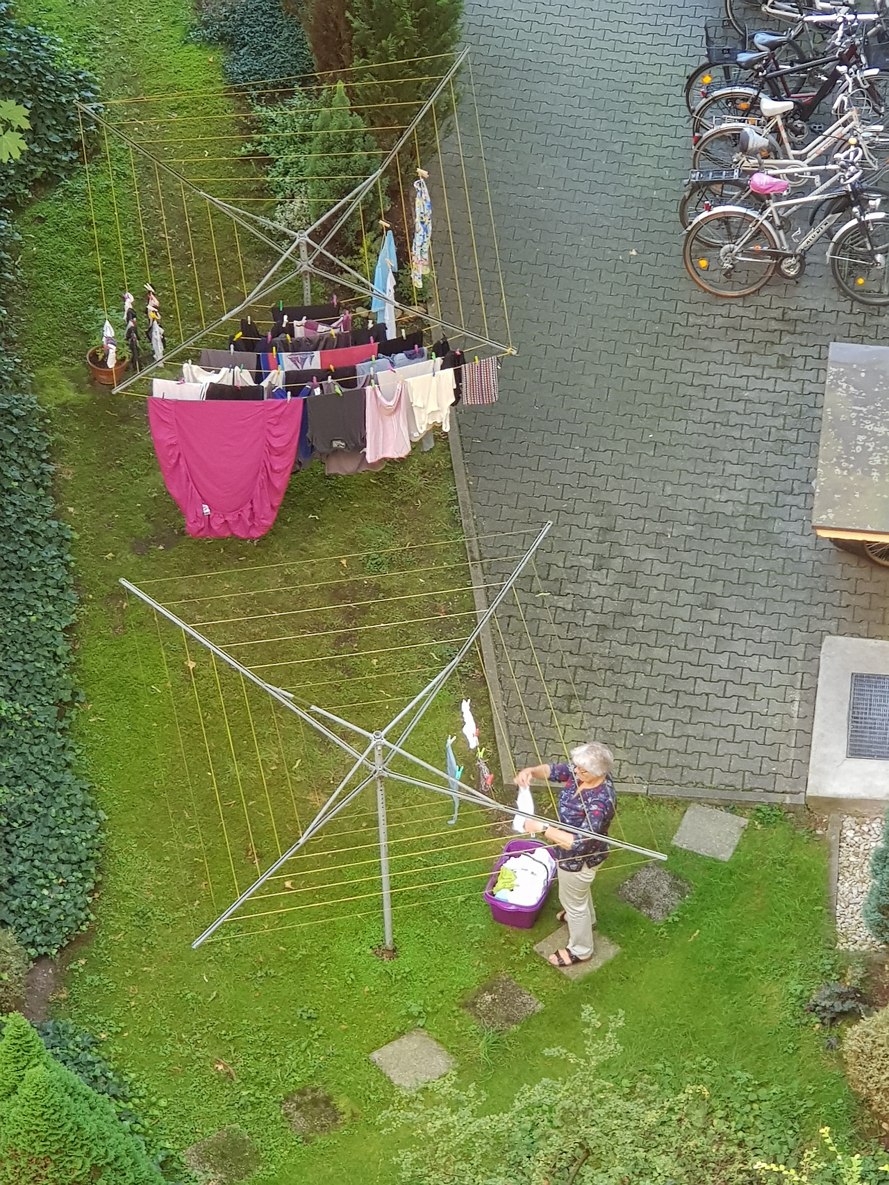 우리 집 부엌과 발코니는 동향이라 아침에 잠깐 햇볕이 들었다. 여름엔 그마저 더워서 발코니 쪽 출입문 창에다 커튼을 달았는데 이젠 그 커튼까지 걷어야 할 때였다. 5층 발코니에서 내려다보니 빨래를 하느라 바쁜 사람이 나 혼자만은 아니었다. 우리 건물 안쪽 마당에는 독일에선 보기 드물게도 거미줄 모양의 빨랫줄이 있는데 아주머니 한 분이 부지런히 빨래를 널고 계셨다. 늘 저분 혼자만 빨래를 너시는 걸 보면 다른 집은 모두 건조기를 사용하는 모양이다. 예전에는 나도 생각 없이 건조기를 마구 돌렸다. 다시 돌아온 독일에서 나는 드디어 주부로 거듭나고 있는 것일까.