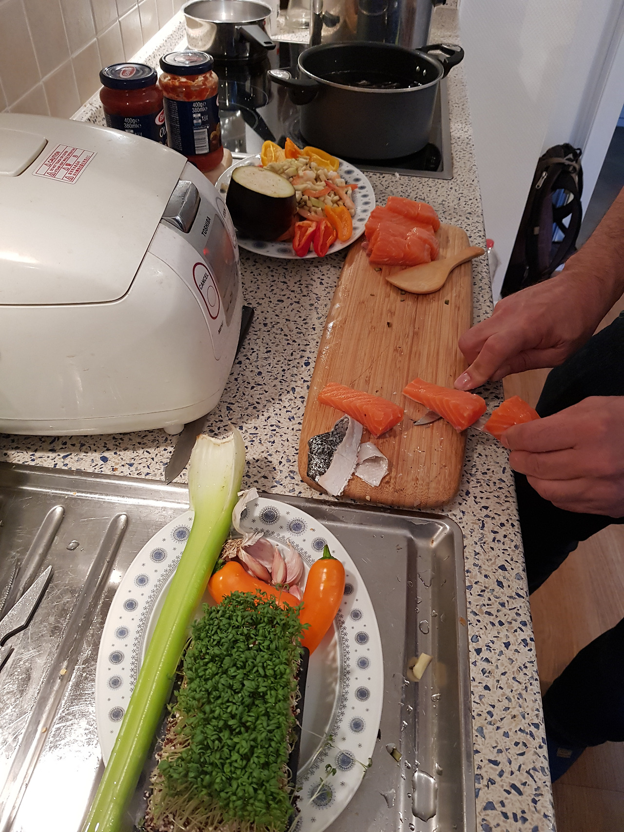 나는 틈틈이 사진을 찍으며 밥을 앉쳐두었다. 이런 수프는 갓 지은 밥과 먹어야 제 맛 아닌가. 원래 독일에서 유명한 건 부야베스보다 헝가리의 굴라쉬 수프인데 조금 짜긴 하지만 우리 입맛에도 제법 맞다. 독일 음식이 느끼할 때쯤 먹어주면 개운하다. 독일 어느 식당에서나 주문이 가능한 대중화된 메뉴. 뚝딱뚝딱 남편의 요리가 시작되었다. 10년도 전에 남편이 시작한 음식이 부야베스다. 남프랑스에 갔다가 한번 먹어보고 내가 좋아하게 된 이후 가끔씩 찬바람이 나면 남편이 준비해 주는 계절식 메뉴가 되었다. 본인의 말에 따르면 홍합을 어떻게 삶느냐가 관건이라나.