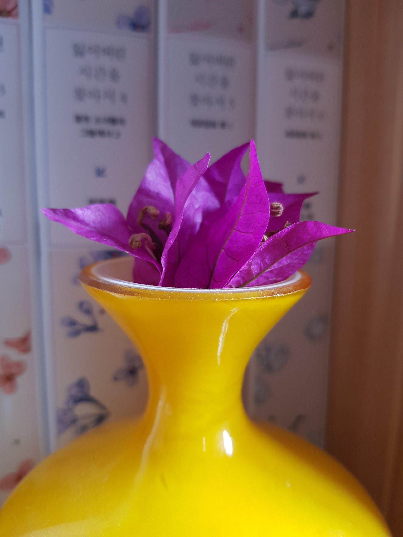 묵직한 질문만 던져놓고 시치미를 뗀 채 무게만 잡고 있는 책을 잠시 내려놓고 진홍빛 부겐베리아 꽃잎을 노란 꽃병에 꽂고 한 발 물러서자 꽃병 뒤편 프루스트의 <잃어버린 시간을 찾아서>가 진군하듯 한 발씩 앞으로 내디디며 꽃들을 둘러쌌다. 잃어버린 지난날들이 붉은 꽃잎처럼 차곡차곡 쌓였다. 낯빛 하나 바래지 않은 채 춤추는 청춘들과의 어울림에도 주저함이 없는 꽃잎들의 가벼움. 저 꽃들에게 어울리지 못할 인생이 있기라도 하단 말인가.