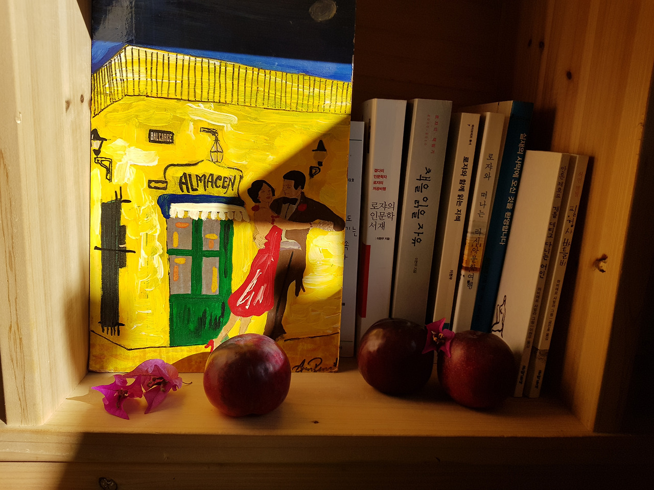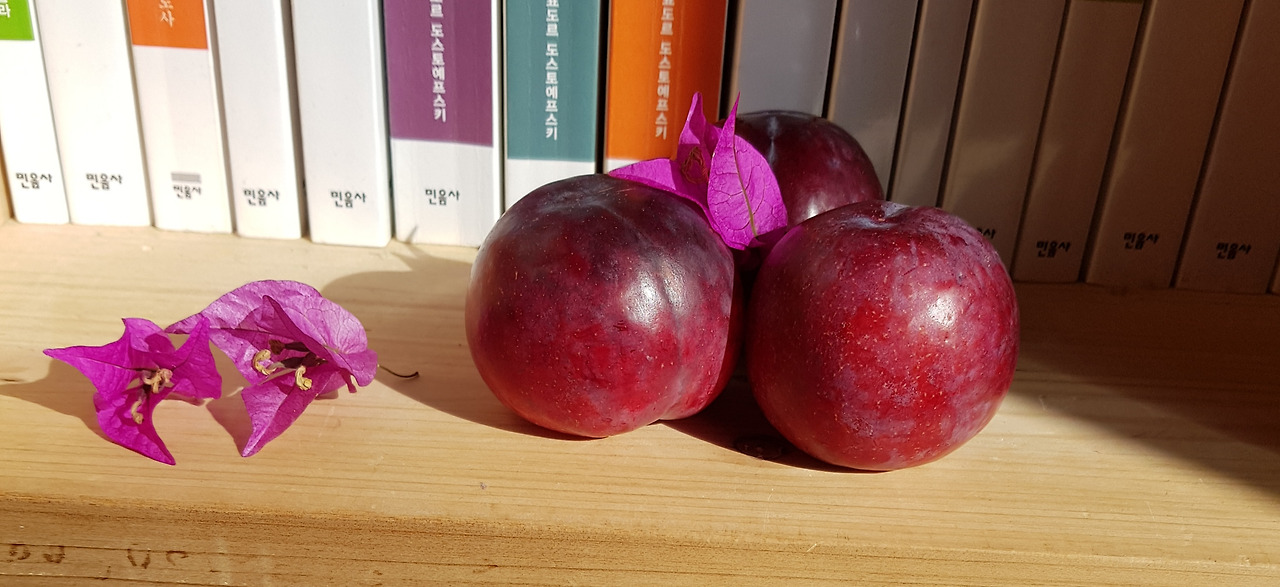 독일에 와서 이토록 행복한 날도 드물었다. 오전에 카페에서 글을 쓰고 집으로 온 건 오후 2시. 아직 햇살이 유리창을 정면으로 향한 책장에 반나마 걸쳐져 있었다. 빨간 사과와 보랏빛 자두를 사들고 오느라 시간이 지체된 것만은 아니었다. 과일을 사들고 걸어오는데 세상에! 이다지도 예쁜 부겐베리아 꽃잎 세 개가 길바닥에 떨어져 있는 게 아닌가. 꽃잎 세 개를 여기도 놓아보고 저기도 놓아보며 감상하느라 배 고픈 줄도 몰랐다. 점심을 차리기도 전에 자두와 사과부터 깨물어 먹었다. 가을 공기에 가을 강과 가을 햇살을 보탠 맛이 났다.