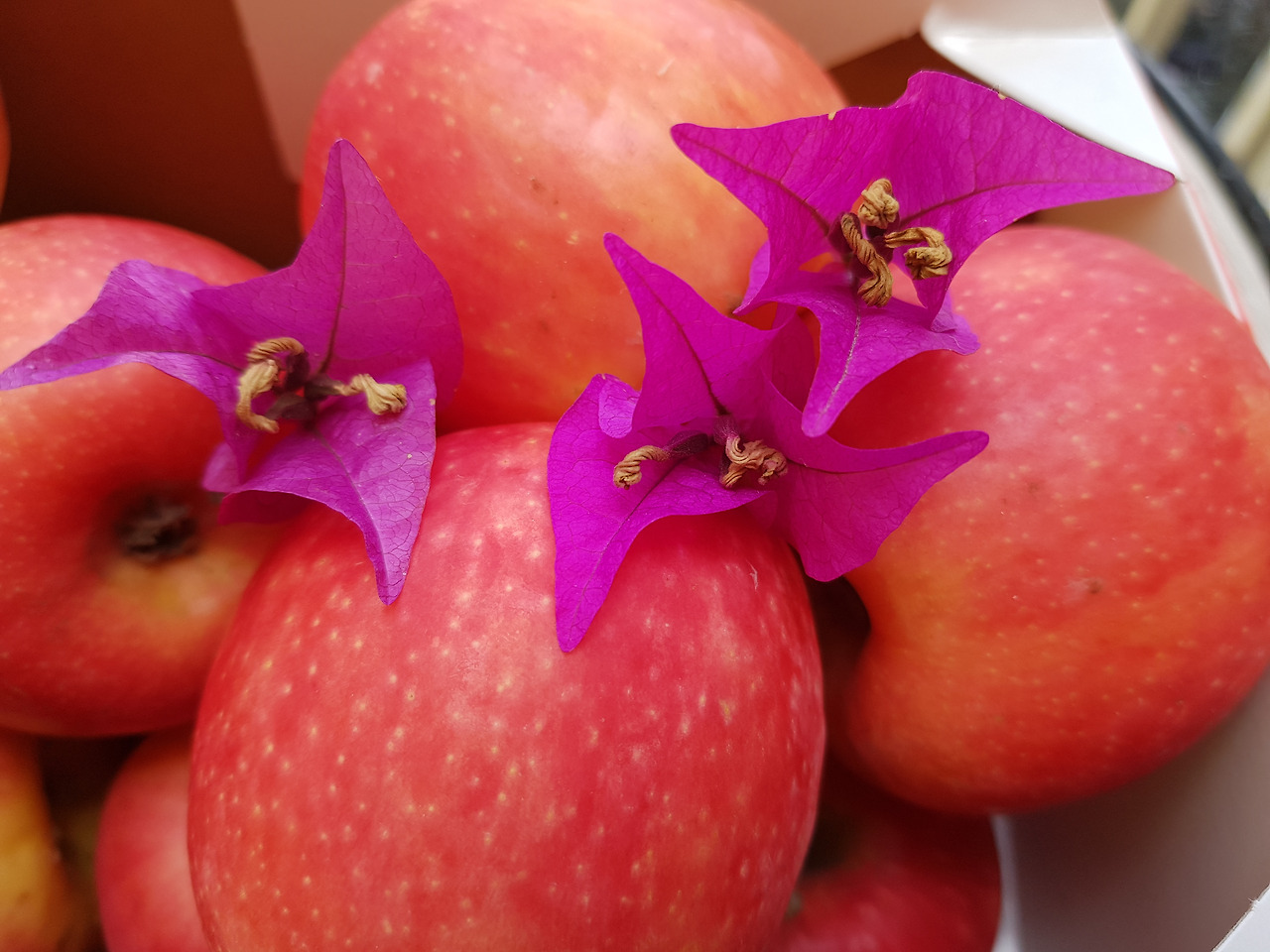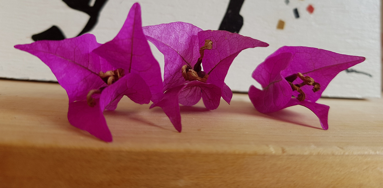 세상에! 이다지도 예쁜 부겐베리아 꽃잎 세 개가 길바닥에 떨어져 있는 게 아닌가.