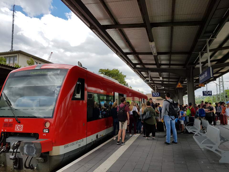 사진: 칼브 지도와 헤세 박물관(위) 칼브-포르츠하임까지는 빨간 기차(아래)를, 포르츠하임-마울브론 구간은 선로 공사 관계로 기차를 이용하지 못하고 시외 버스로 이동해야 했다.