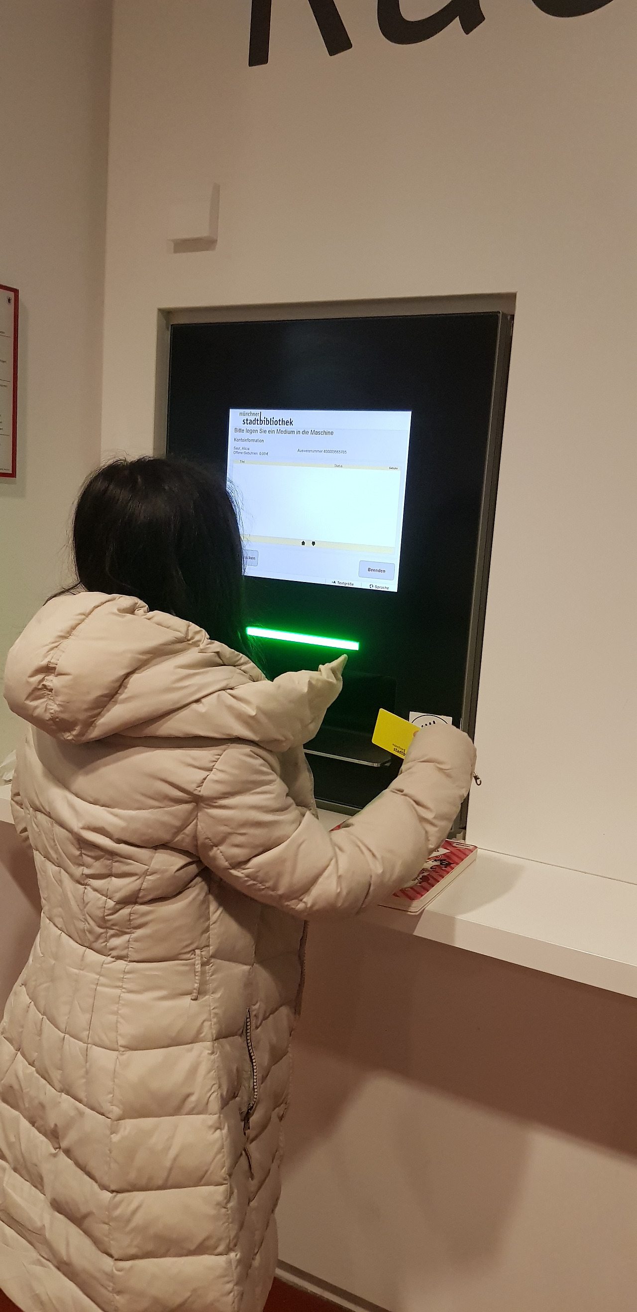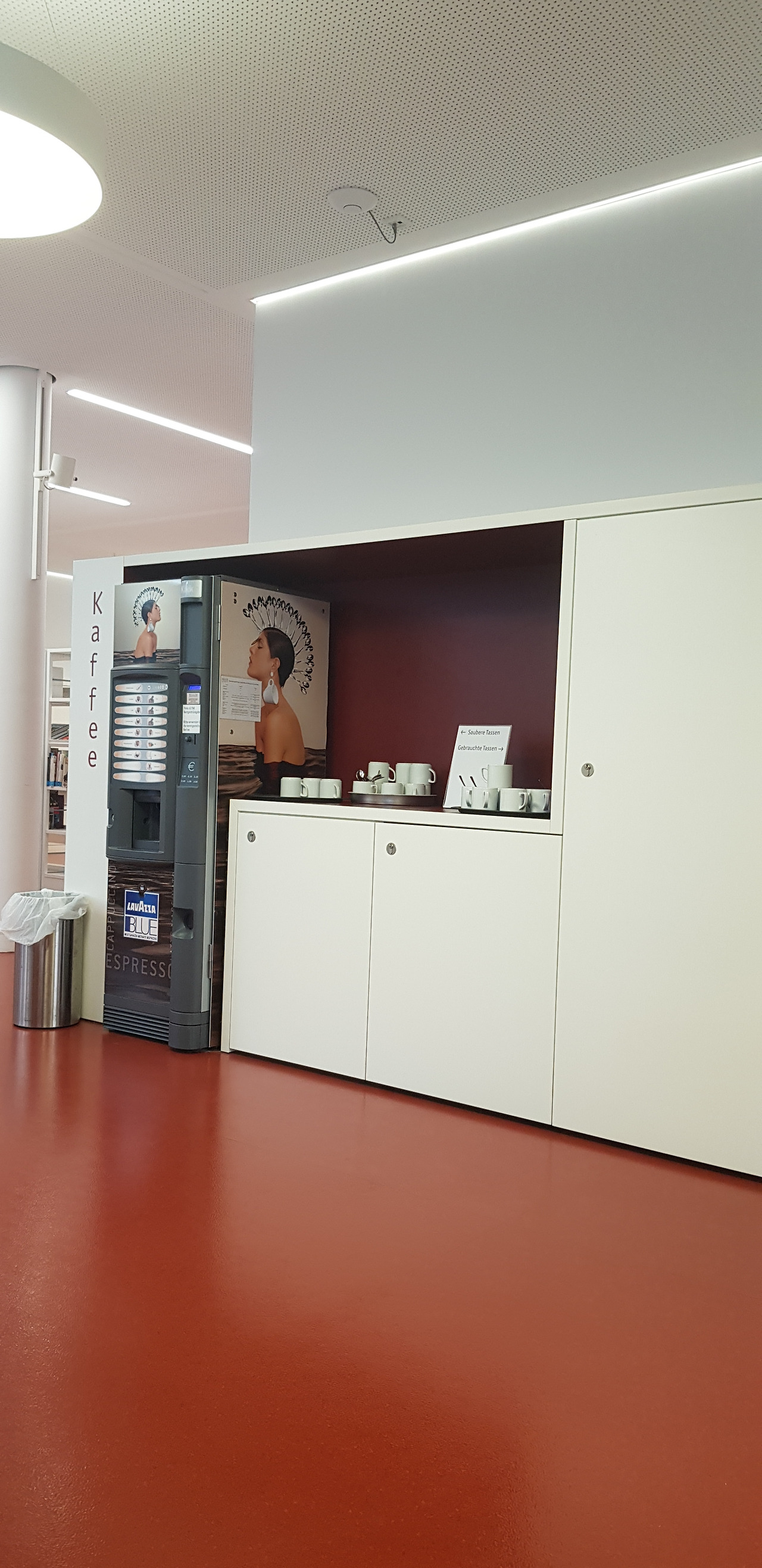 생각보다 도서 수가 그리 많지는 않았는데 한 명당 스무 권씩 빌려가면 서가에 꽂힌 책이 적을 수도 있겠다. 이 도서관은 시립도서관이고, 독서가든 Lesegarten이라는 야외 정원도 있었다. 내년 봄과 여름이 기대된다. 1층의 도서 대여 기계 수는 2대, 입구에는 공휴일과 늦은 시간에도 반납이 가능한 기계가 2대가 비치되어 있었다. 도서관 안에 별도 카페는 없고, 1층 정보물 잡지 코너에 독일에서 보기 힘든 커피 자판기가 있었다. 가격은 균일 70센트. 아이는 핫초코를 나는 매번 다양하게 시음해 봤는데 맛있었다. 특이한 건 1회용 사용을 자제하기 위해 머그컵이 비치되어 있다는 것. 머그컵이 놓인 아래 수납장이 식기 세척기였다.
