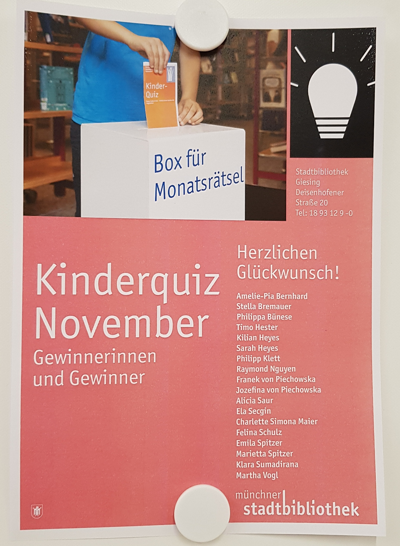 P.S. 그날 저녁 도서관에 가니까 지난번 이진이와 함께 퀴즈 맞추기 추첨통에 넣은 게 알리시아만 당첨되었다. (이진아, 미안해! 선물은 직접 고르라고 했는데 아이는 골라도 참 희안한 걸 고르더라. 내 참, 책도 많던데!) 집으로 돌아올 땐 12월 퀴즈도 들고 왔다. 11월 추첨 인원은 총 18명이었다.