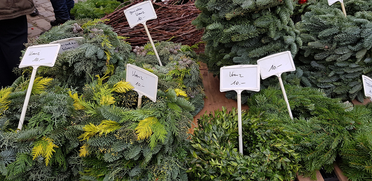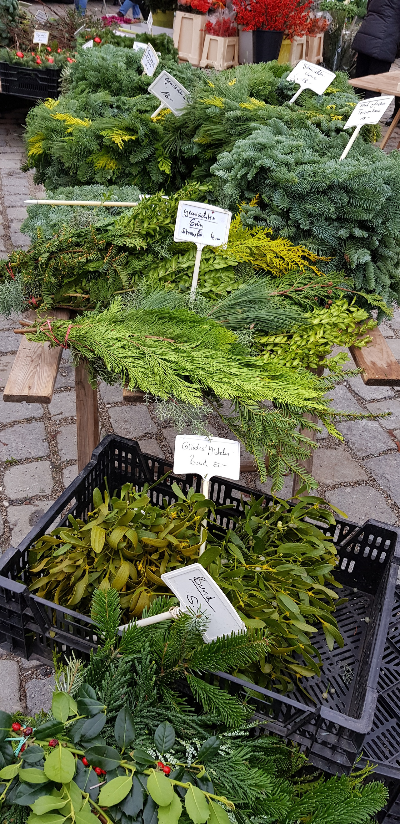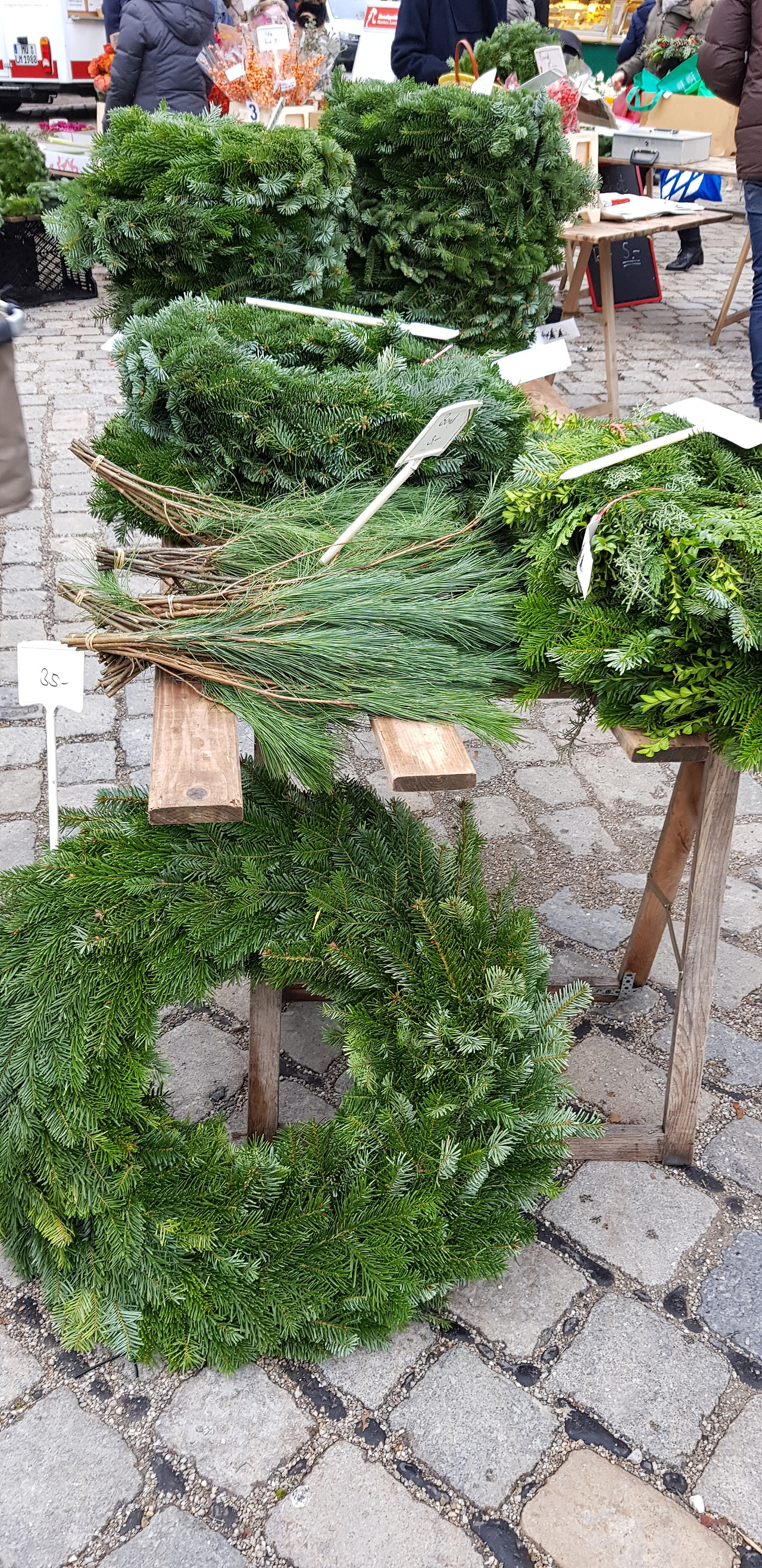 장터에는 한창 크리스마스 장식을 팔고 있었다. 12월 첫 주부터 하나씩 켜는 장식초 4개(아드벤츠 크란쯔 Adventskranz:강림절초)도 여기서 파는구나! 아드벤츠 크란츠를 만들기 위한 전나무 리스도. 촛불은 12월 첫 번째 일요일부터 하나씩 켠다. 역시 장터에 와서 보고 배우는 게 많다. 사계절과 절기가 생생하게 느껴지는 곳. 장터야말로 도시인들의 삶이 펄펄 살아 숨 쉬는 곳이었다. 대도시에 살면서 흙냄새 나는 야채와 과일과 빵을 사는 즐거움.