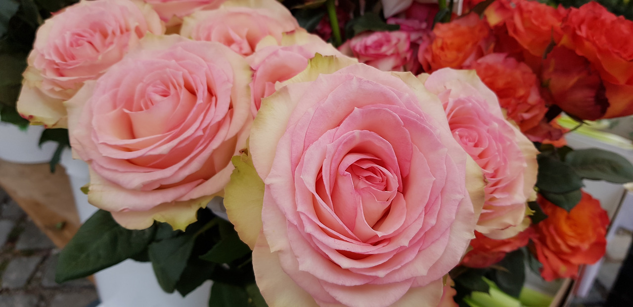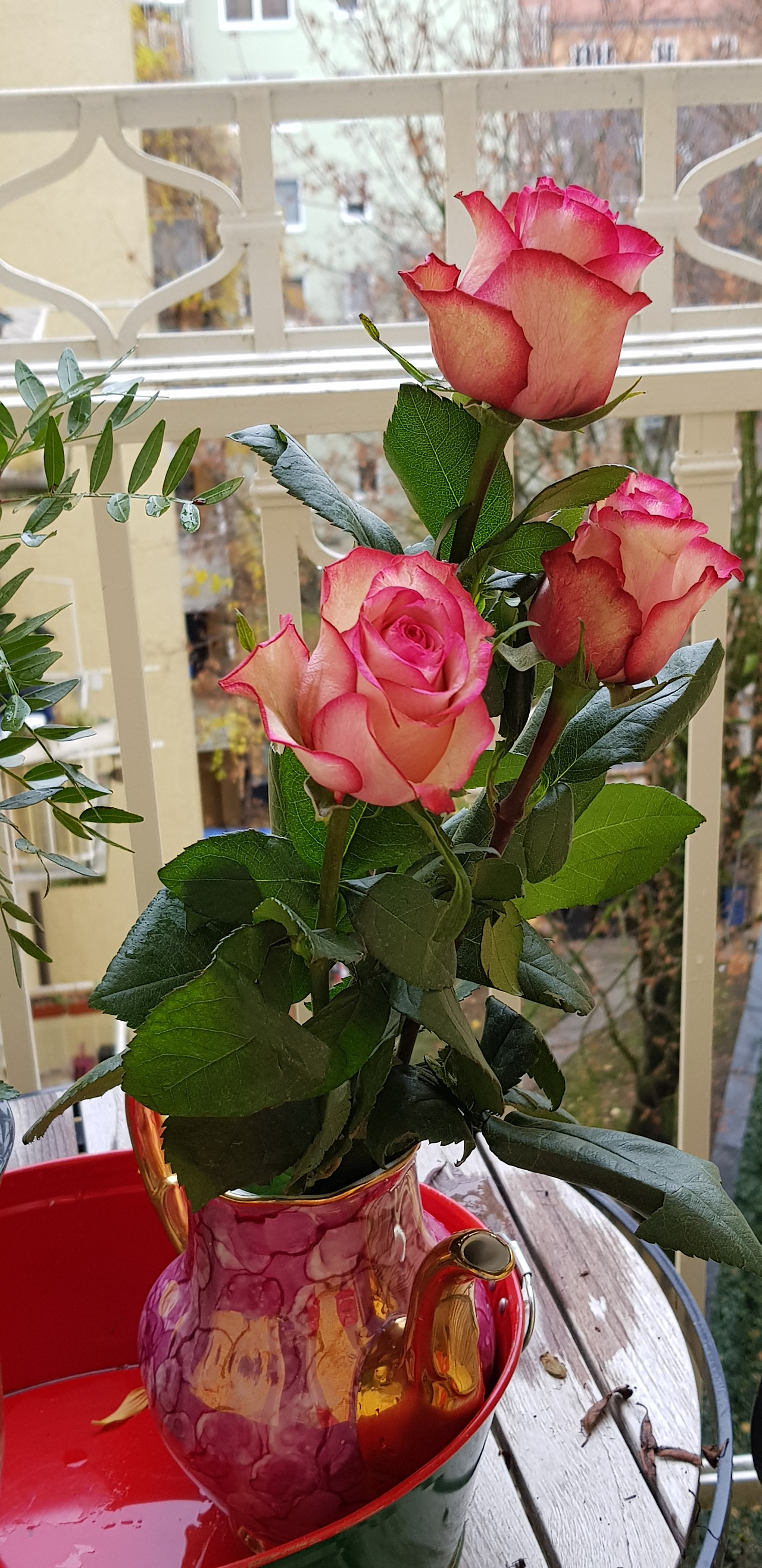 칼비노의 표현을 빌리자면 도시가 아치라면 수많은 장터들이 돌 역할을 하는 걸까. 장터의 돌바닥 위에 색색으로 피어난 초들이 꽃처럼 예뻤다. 당연히 꽃도 샀다. 탐스런 장미가 송이당 2유로, 세 송이에 5유로였다. 집으로 돌아와 세 송이를 핑크 찻주전자에 꽂았더니 환상적이었다. 각박해지지 말라고 매주 집 가까이에서 연주되는 삶의 이중주.