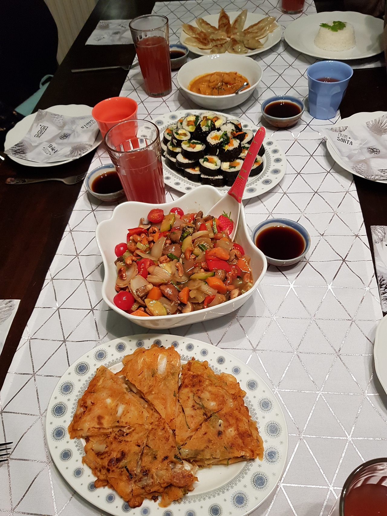 2018년의 마지막 밤은 아이의 친구 율리아나네와 함께 보내기로 했다. 내가 준비한 것은 김밥, 야채만두, 그리고 김치전. 물과 식초를 섞은 연한 간장에 찍어 먹었는데 율리아나가 제일 잘 먹었다.