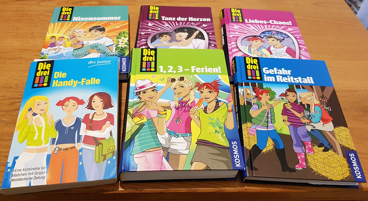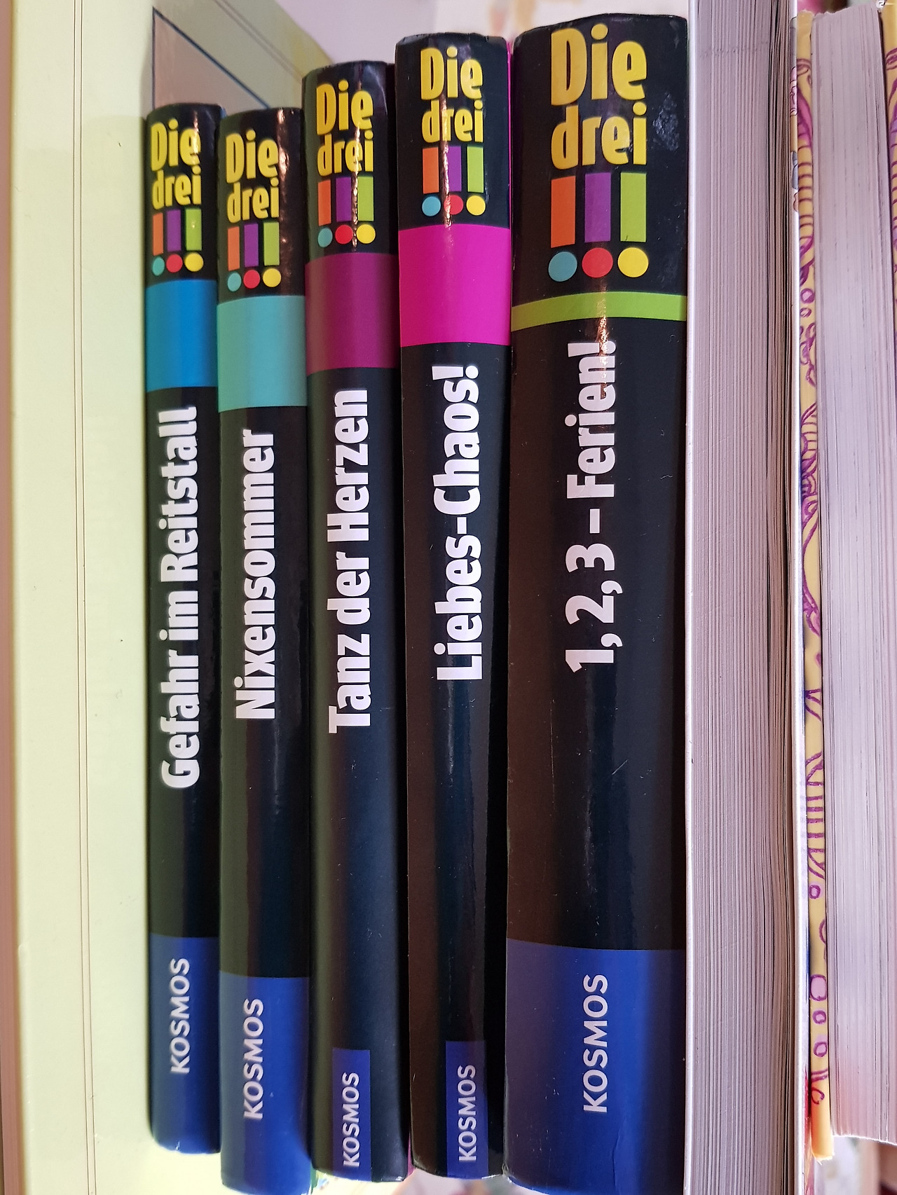 중고 서점에 들른 건 아이의 책을 고르기 위해서였다. 초등 4학년 정도가 읽을 만한 시리즈로 용감하고 똑똑하고 호기심 많은 여학생 셋이 벌이는 좌충우돌 추리물이다. 독일 아이들에게는 꽤나 유명한 모양이었다. 제목은 <셋(삼총사/세 친구) Die drei!!!> 제목에 느낌표가 들어간 이유가 있다. 원래 이 시리즈는 초등 저학년용으로 남자아이 셋을 중심으로 벌어지는 에피소드인데 다음과 같이 제목에 물음표 세 개가 찍혀 있다. <셋 Die Drei???>. 도서관 서가에 꽂혀있는 두 시리즈물을 보고 관심을 갖게 된 이유는 내가 읽어도 괜찮을 것 같아서였다.