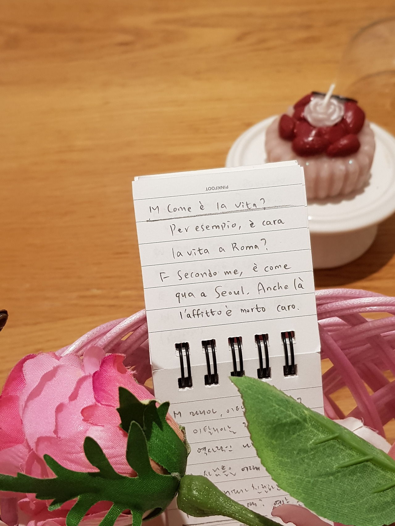 한번 결정을 하면 나는 재빨리 행동에 옮기는 편이다. 심사숙고란 없다. 지난 주말에 바바라에게 자극을 받은 끝에 당장 이태리어 공부를 실행에 옮겼다. 월요일 저녁이었다. 남편이 출장을 가는 바람에 아이에게 책을 읽어주고 일찍 잠자리에 들었다. 그런데 책꽂이 상단에 나란히 꽂혀 있는 외국어 책들 중 이태리어가 눈에 꽂히는 게 아닌가. 문제는 이틀 정도 들고 다녀보니 여간 무거운 게 아니다. 치사한 방법으로 아이에게 손바닥만 한 사이즈의 메모용 노트를 얻었고, 거기에 간단한 생활 회화를 옮겨 적던 중이었다. 오며 가며 읽으려고.