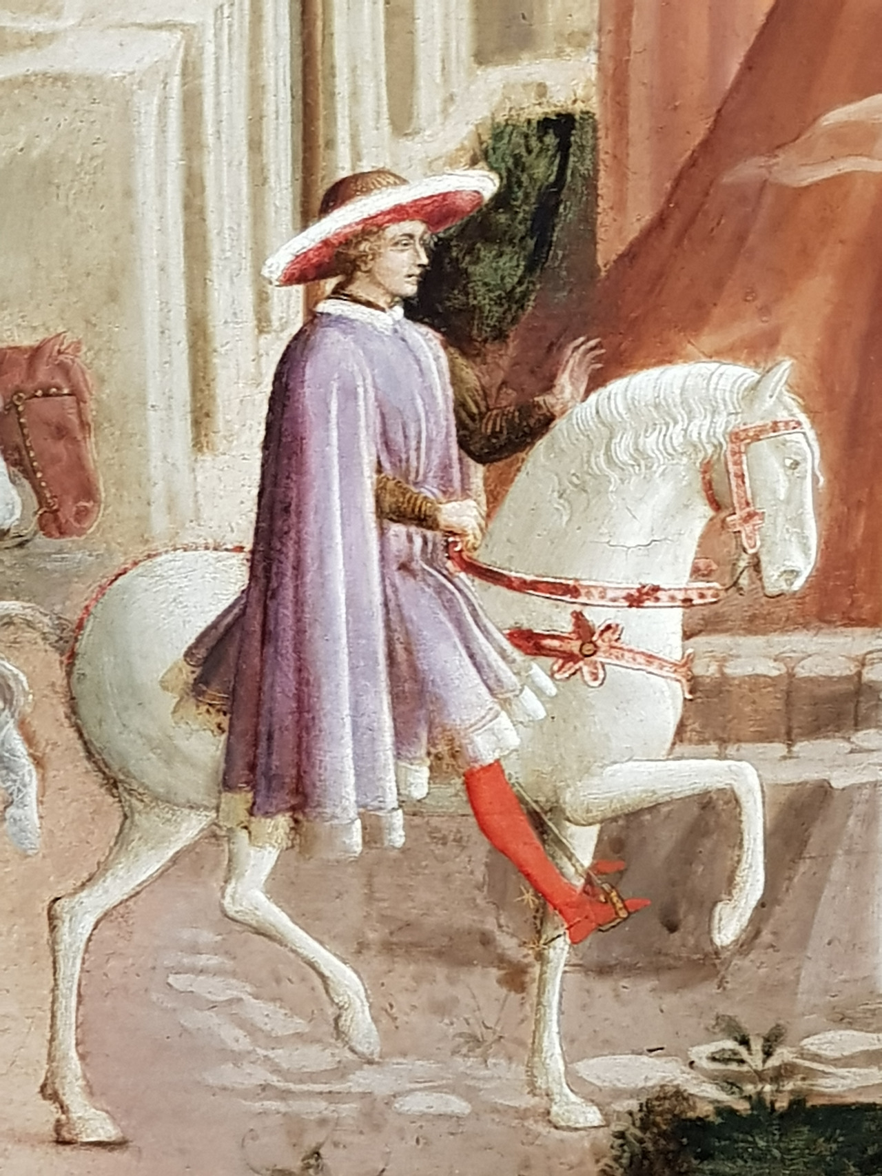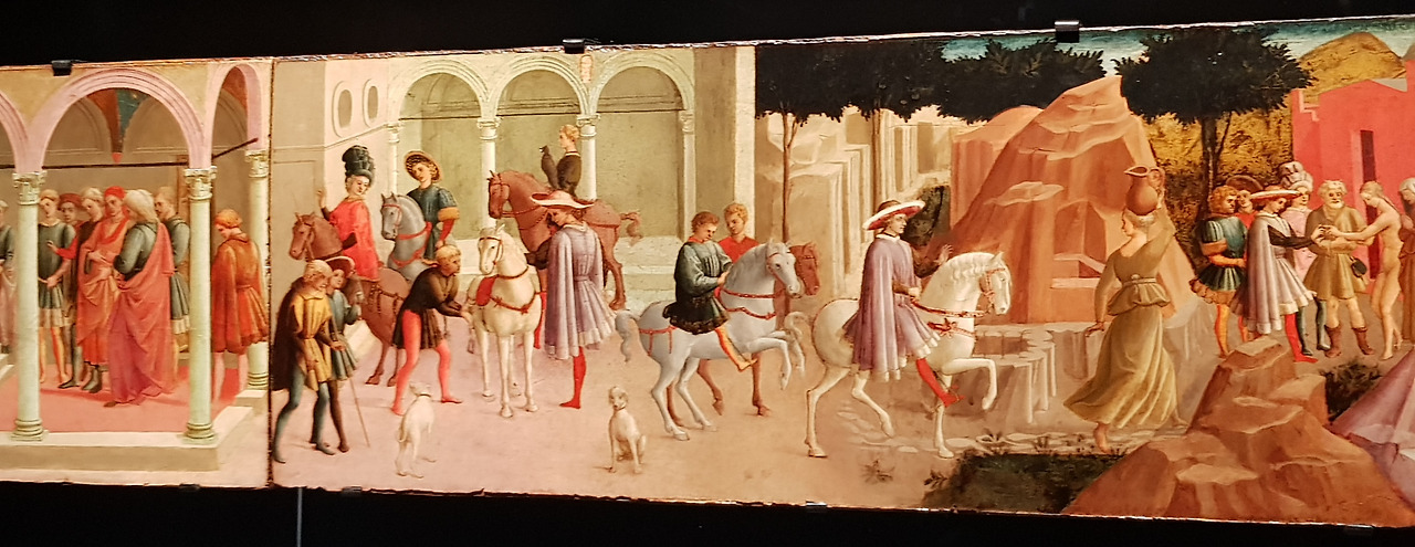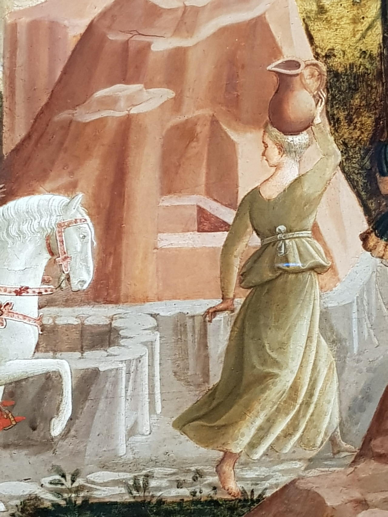 또 있다. 그림 속의 로맨스를 살짝 엿보는 즐거움도 빼놓을 수 없지. 보는 순간 슬그머니 웃음을 짓게 하는 백마 탄 젊은 남자의 저 발랄한 빨간 레깅스를 보라. 그의 부름에 뒤를 돌아보는 여인의 경쾌하게 동여맨 짙은 그린 드레스와 역동적인 몸짓, 가벼운 발걸음 그리고 그녀의 머리 위에 올려진 부드럽고 둥근 항아리의 곡선을 보라. 이것은 전시를 보기 전에는 이름도 몰랐던 페셀리노 Pesellino의 작품 <그리셀다 이야기>. 원제는 La Storia di Griselda.