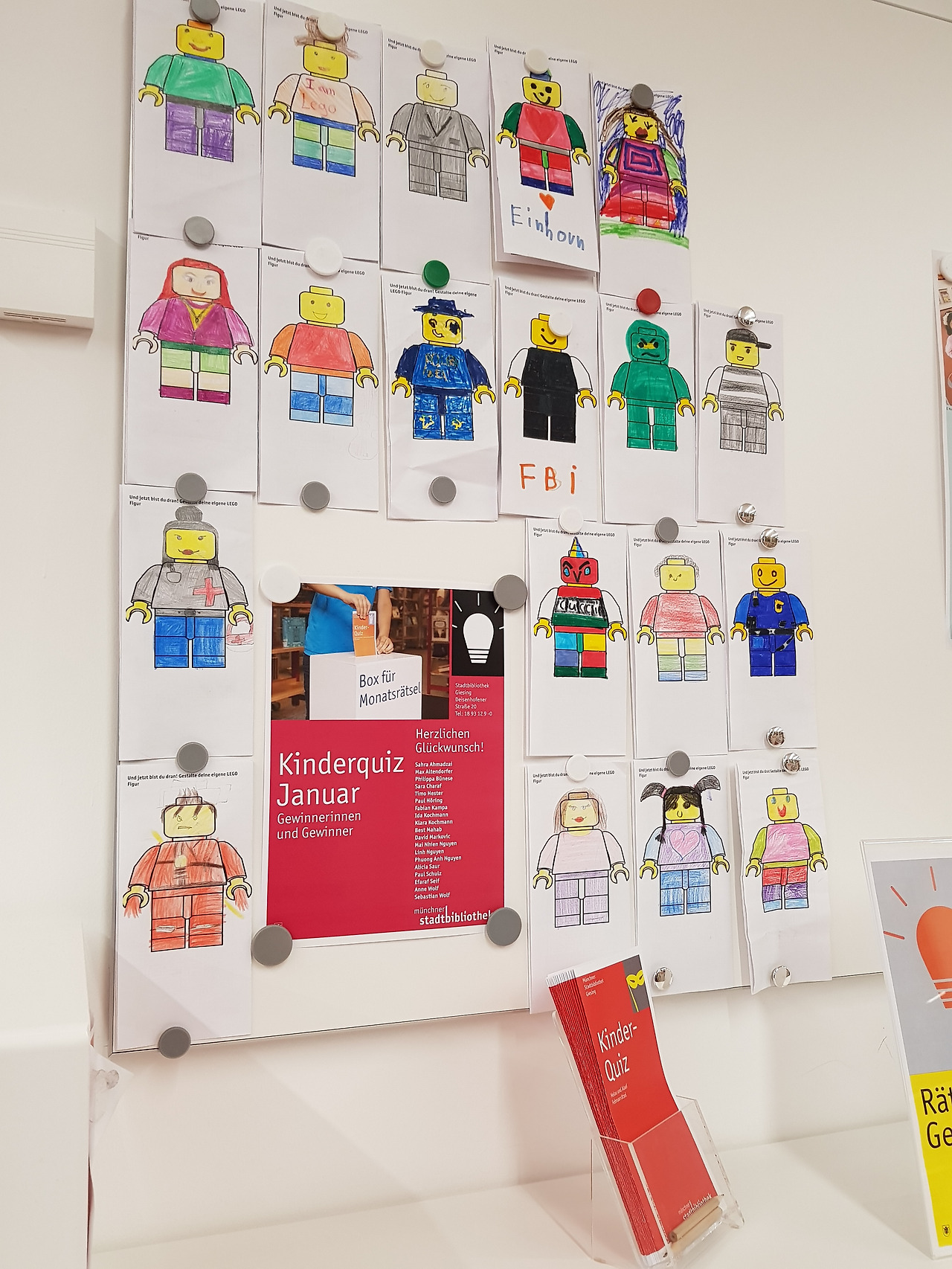 아이가 이 도서관을 좋아하는 이유는 매달 시행하는 어린이 퀴즈 때문이다. 정답을 꼭 맞혀야 하는 건 아닌 모양이다. 아이는 두 번 응모해서 두 번 다 뽑혔는데, 2월의 당첨자 명단을 보니 1월에 응모한 어린이 전부에게 상을 주는 게 아닐까 싶을 만큼 그 수가 많았다. 발표자 명단에 붙은 아이들은 총 18명. 한 가지 주제에 대해 몇 가지 질문과 주제에 맞는 그림을 그리게 한다. 아이들이 관심을 가지고 참여하도록 동기를 부여하는 것. 행위 자체를 독려하고 상을 주는 것이 목적이다.