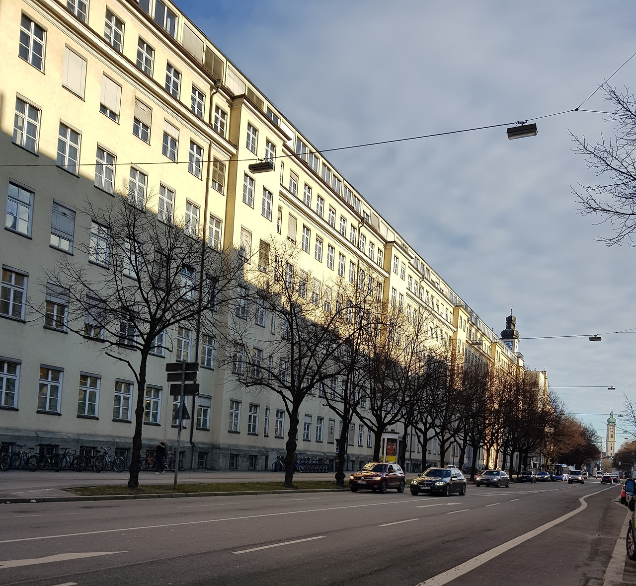 이 건물 오른쪽 끝에 학교가 있다. 운동장은 건물 안쪽. 도로 오른편 끝은 빅투알리엔 마켓과 마리엔 플라츠로 연결된다.