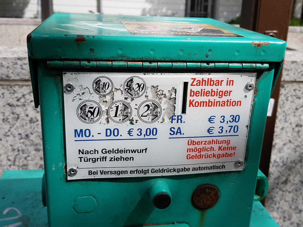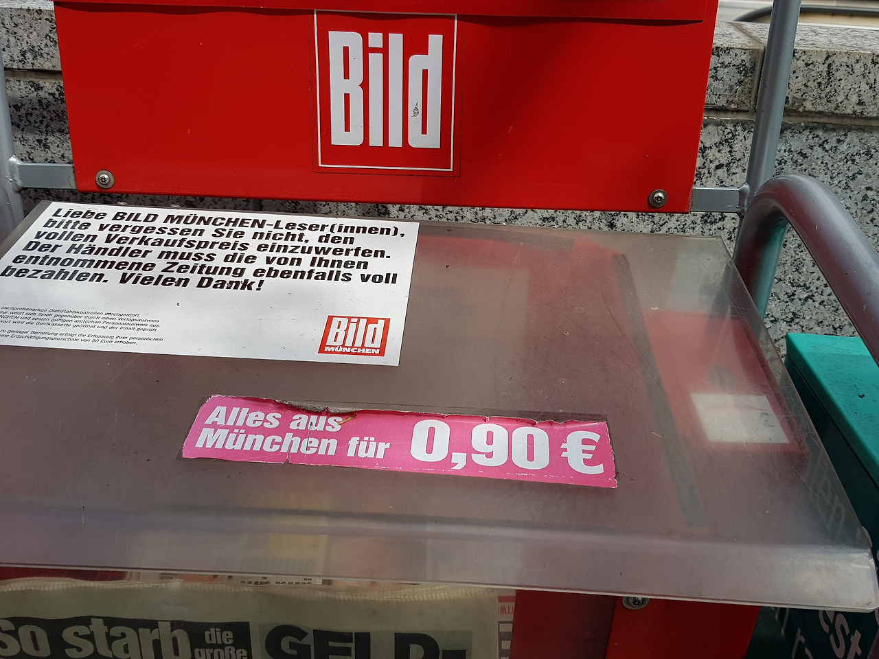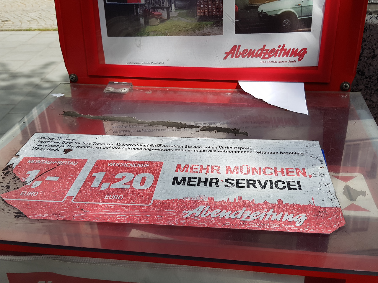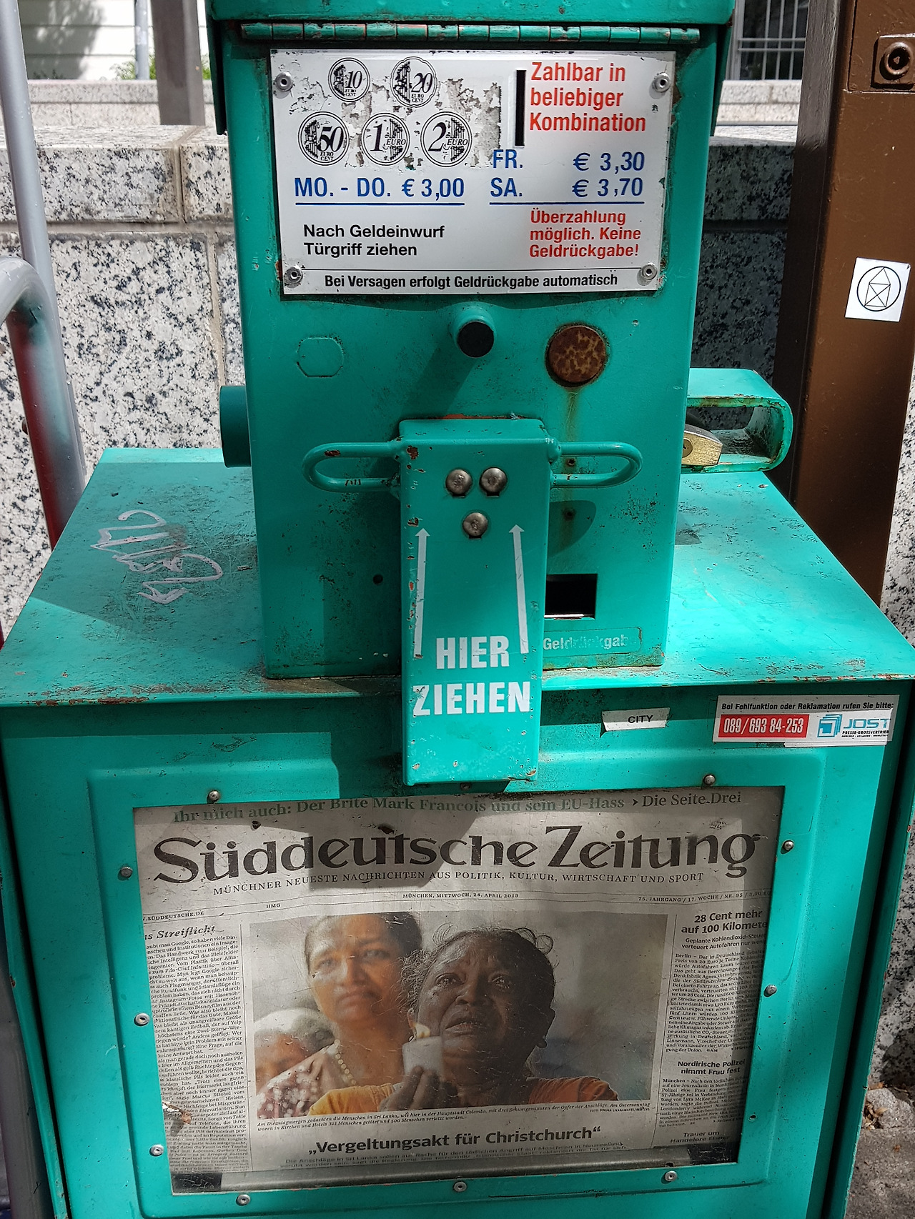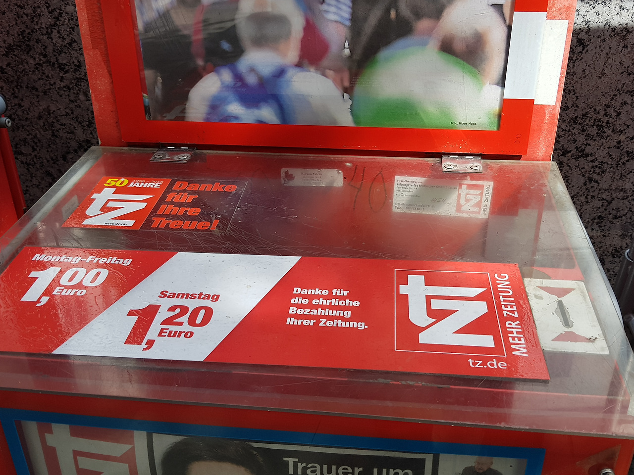 우리 집 앞에는 빨간색 무인 신문 가판대도 있다. 동전을 넣고 셀프로 신문을 직접 가져간다. 동전을 넣어야 물건이 나오는 신문은 한 종류뿐이다. 쥐드 도이체 짜이퉁.다른 세 종류는 동전을 넣는 곳은 따로 있고, 뚜껑을 열고 신문을 가져가면 그만이다. 양심 자율 판매대 정도로 생각하면 되겠다. 명망 있는 일간지 쥐드 도이체 짜이퉁은 가격도 다른 신문의 세 배다(월-금 3유로/금 3.30유로/토 3.70유로). 다른 빨간 신문들은 평일 1유로, 주말 1.20유로 정도.