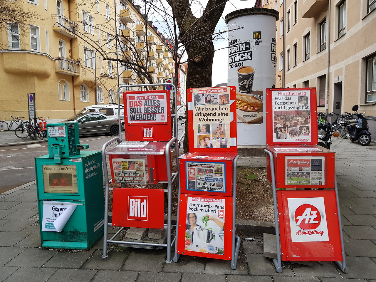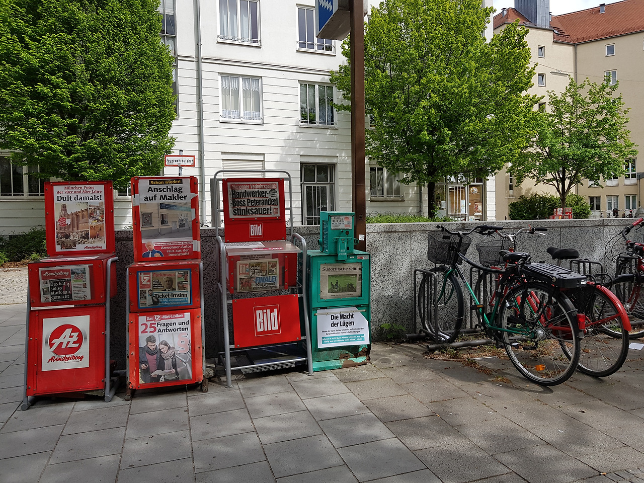 무인 신문 가판대. 파란색은 쥐드 도이체 짜이퉁.